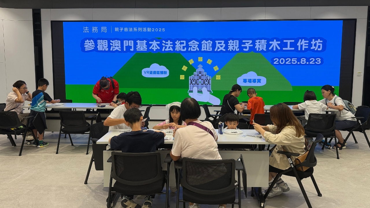 活動中,親子們透過導賞講解和普法問答有獎遊戲,了解《澳門基本法》的成功實踐、一國兩制的成就,以及澳門在不同歷史階段的發展風貌等內容。親子們還體驗了館內的VR普法遊戲,以及共同拼砌以大三巴牌坊為主題的微型積木,促進親子共學,增添普法趣味。