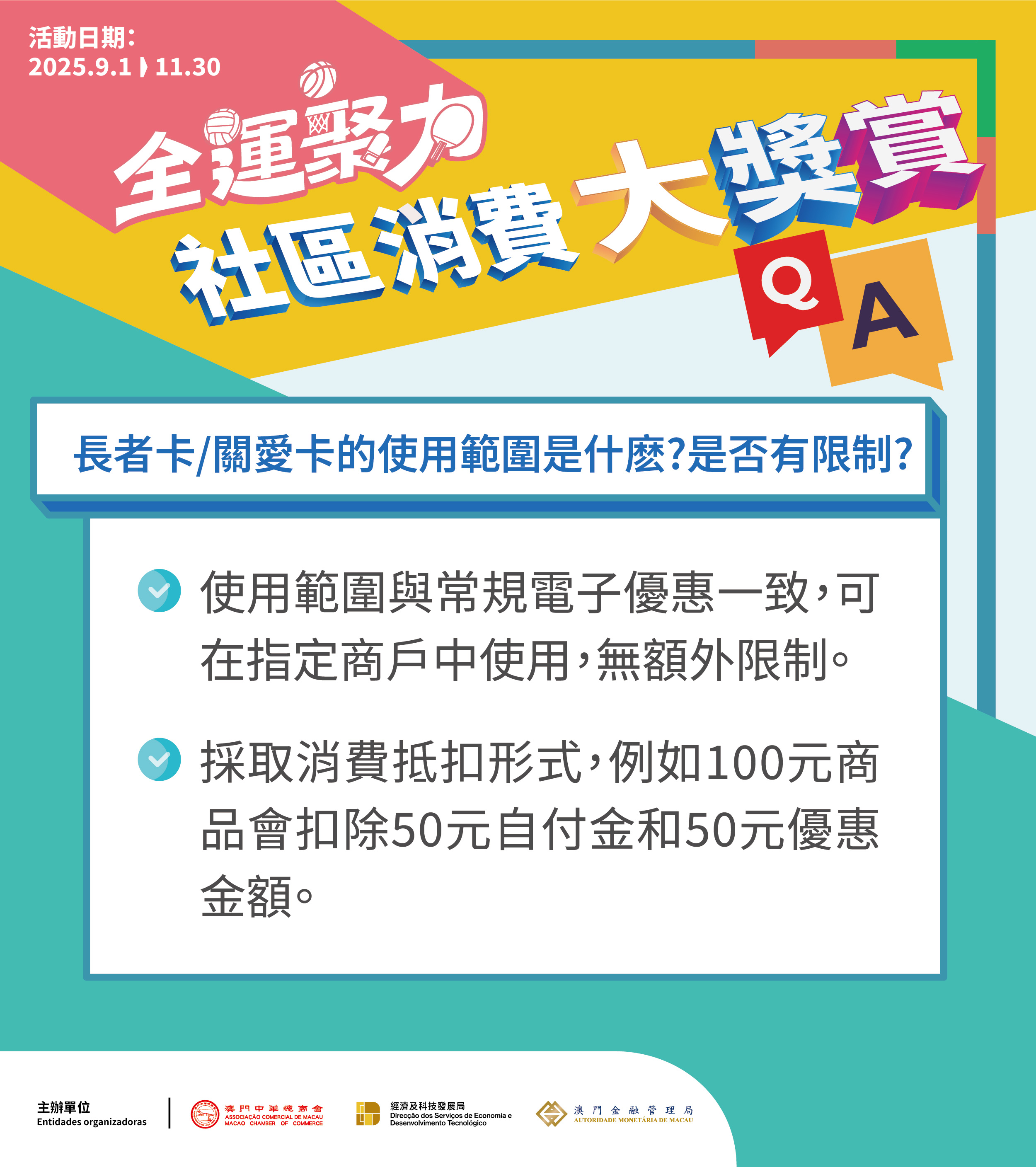 為方便消費者識別,主辦單位陸續為全澳2萬間可核銷優惠的商戶張貼及派發海報和座枱卡。不可核銷優惠的交易場景與以往相同,市民可於活動專題網頁查閱。其他內容及詳情,亦可查閱專頁或於辦公時間致電查詢熱線2857 5472或2857 5439。