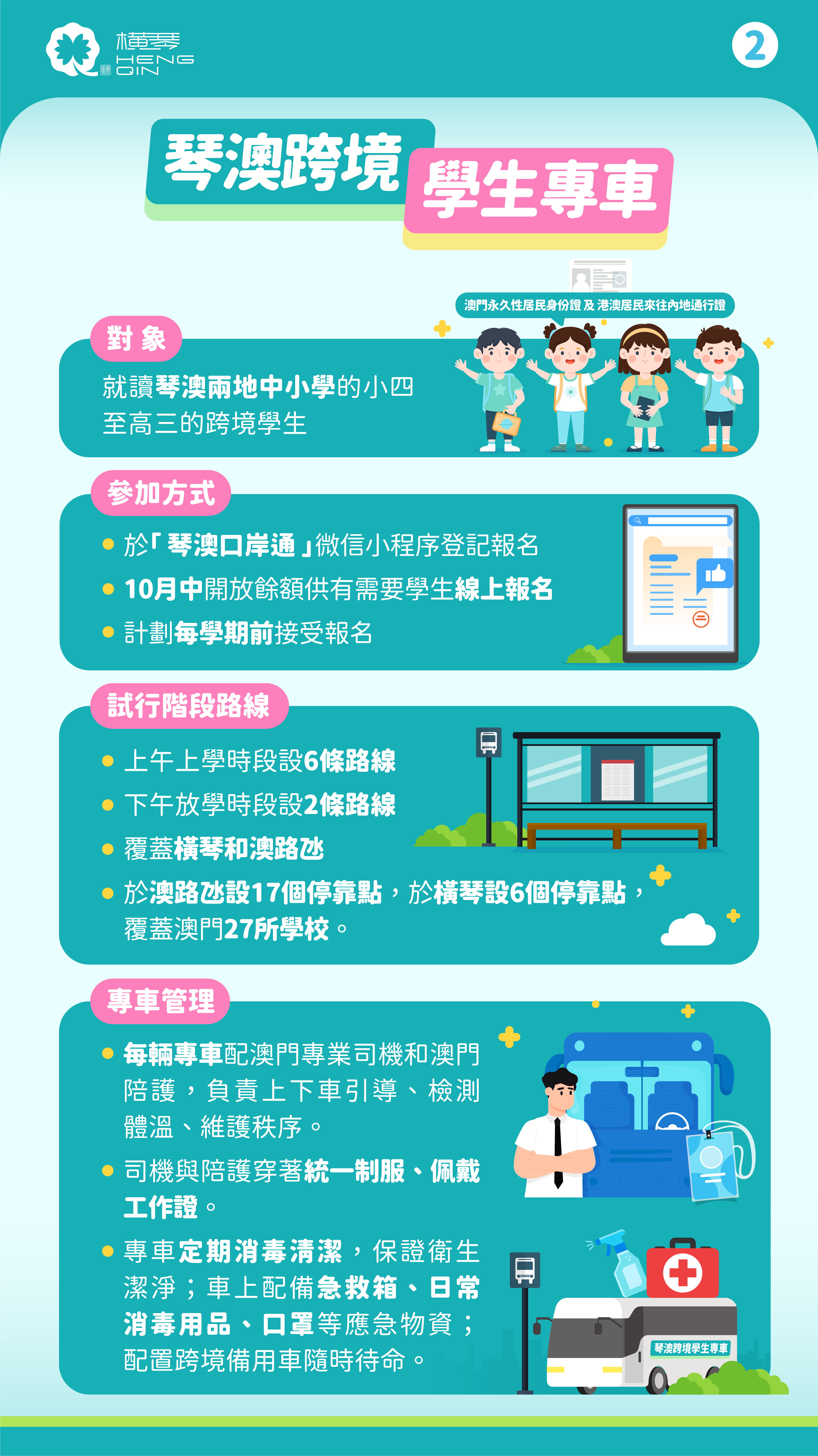 琴澳跨境學生專車試運營階段服務對象為在琴澳兩地跨境就讀的小四至高三學生群體,且需為持有《港澳居民來往內地通行證》的中國籍澳門永久性居民。該服務以2025/2026秋季學期為試運營階段,在上午上學時段設6條路線,下午放學時段設2條路線,分別於澳門半島、氹仔、路環設17個停靠點,於合作區設6個停靠點,服務範圍覆蓋澳門27所學校。本次服務於“琴澳口岸通”微信小程序登記報名,首批已有65名學生報名乘坐專車,10月中開放餘額供有需要學生線上報名,並計劃每學期前接受報名。