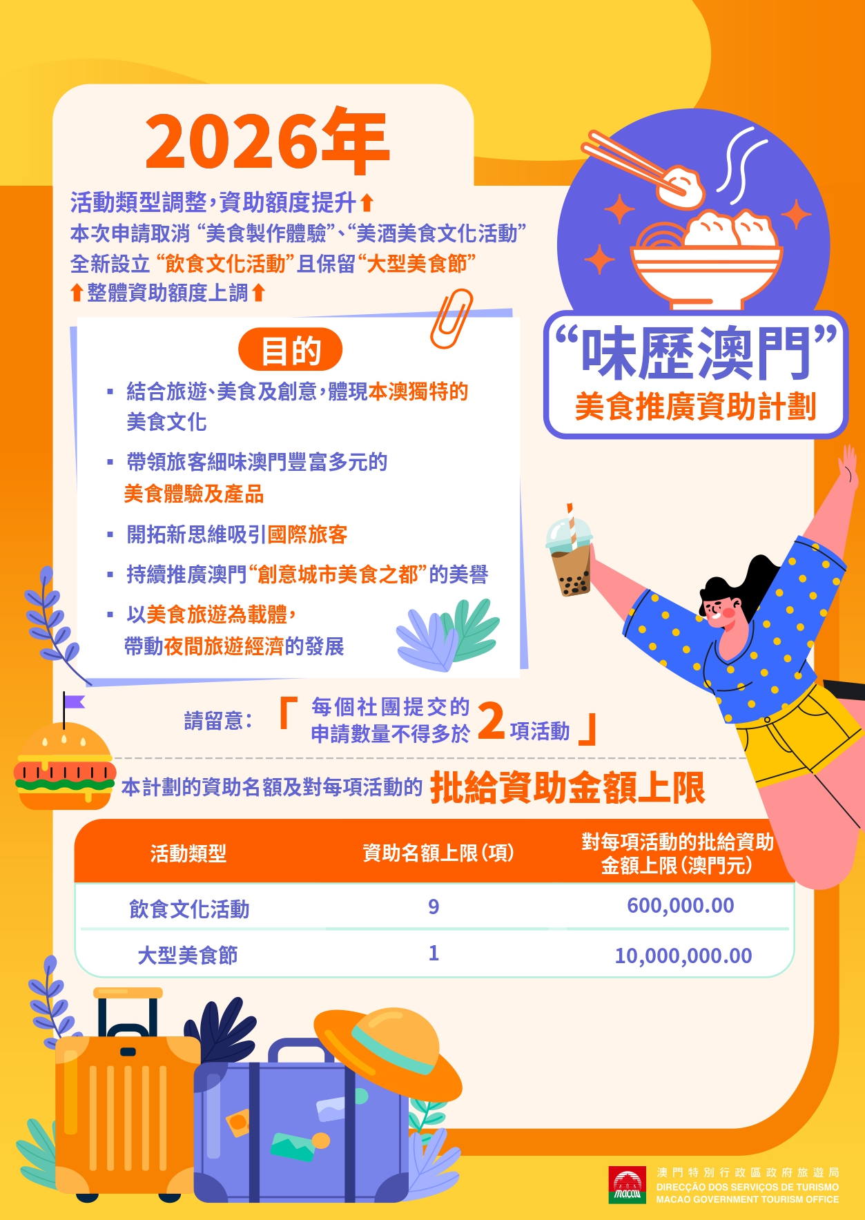 “味歷澳門”美食推廣資助計劃:結合旅遊、美食及創意,體現澳門獨特的美食文化,帶領旅客細味澳門豐富多元的美食體驗及產品,開拓新思維吸引國際旅客,持續推廣澳門“創意城市美食之都”的美譽,以美食旅遊為載體,帶動夜間旅遊經濟的發展。此計劃的活動分為飲食文化活動及大型美食節兩個類型。