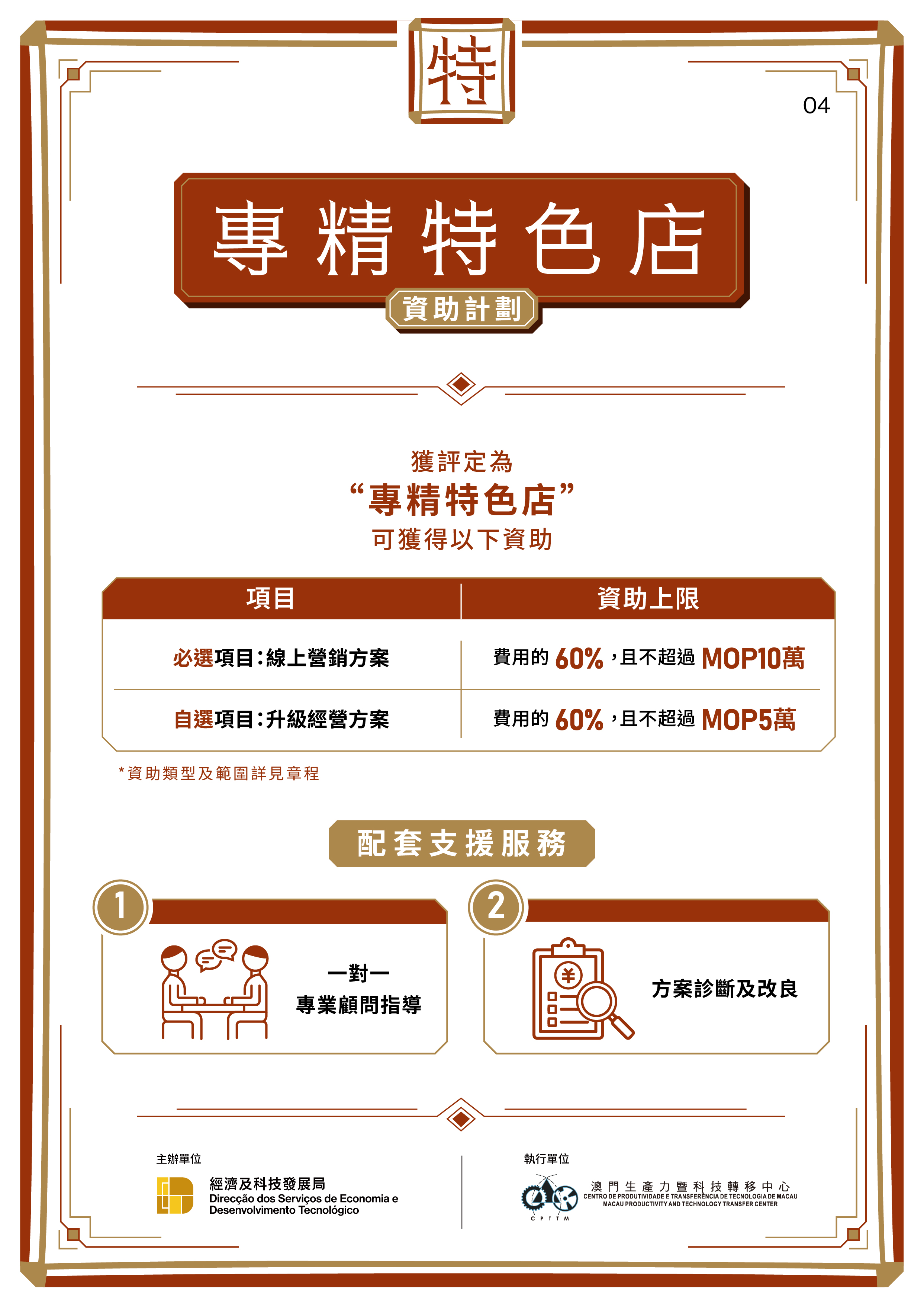 獲評定為“專精特色店”的中小企業,可獲資助實施線上營銷、打造特色店面,以及推出IP聯乘商品相關指定費用的六成資助,上限15萬澳門元。此外,執行單位將為“專精特色店”提供一對一專業顧問指導,並對其商業計劃書及經營方案進行診斷及改良。