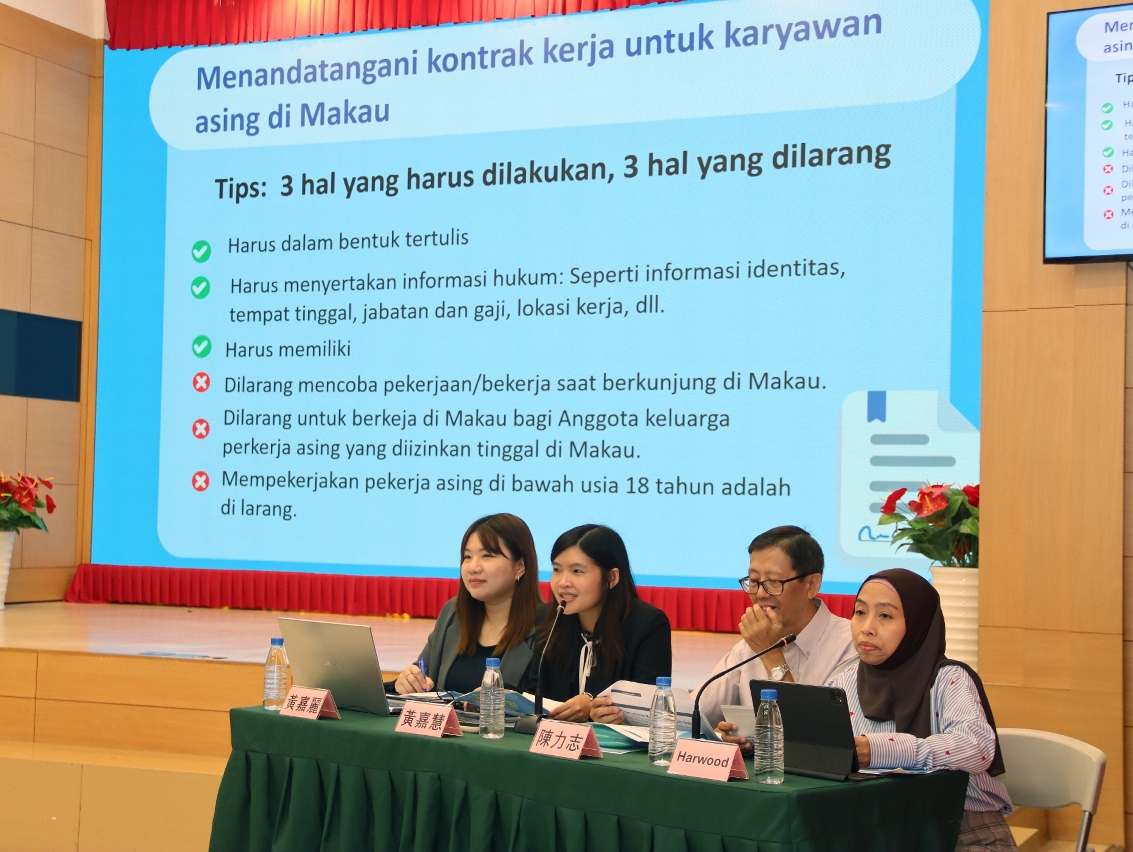 講座由法務局代表主講,並由澳門歸僑總會代表提供印尼語的即時傳譯,內容聚焦外地僱員在澳門工作及生活所需注意的法律規範,包括《勞動關係法》、《公共地方總規章》、《預防和控制環境噪音》、《道路交通法》 等法規,旨在幫助外地僱員了解自身的權利與義務,以及違法行為的相應法律責任等。