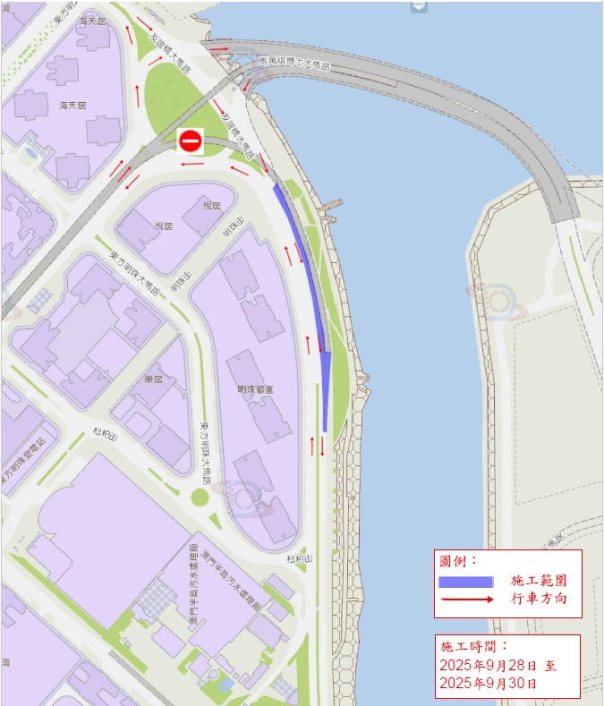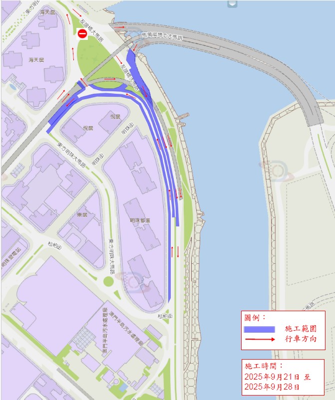 為配合友誼圓形地行車天橋第二期建造工程,友誼橋大馬路、東北大馬路及友誼圓形地周邊道路將於2025年9月21日至9月30日進行瀝青重鋪工作,期間將實施以下臨時交通改道措施(詳見列表及附圖),請駕駛者留意現場交通指示標誌、遵守現場交通警員的指揮及安排。