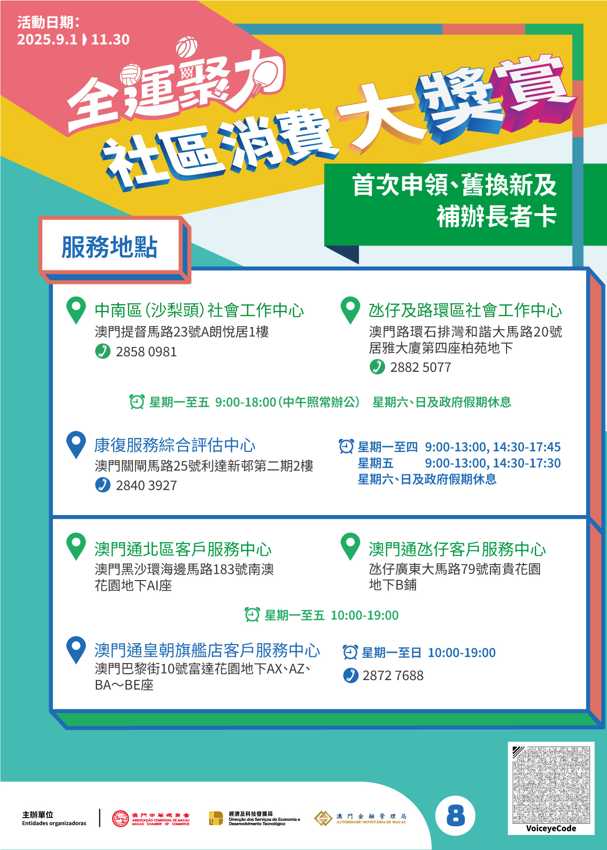 因應“全運聚力‧社區消費大獎賞”推出已近一個月,經檢視社會需求後,北區(台山)社會工作中心、西北區(青洲)社會工作中心、氹仔及路環區社會工作中心(氹仔分站)三個服務地點將於明(1)日起停止提供長者卡首次申領、舊換新及補辦的服務。