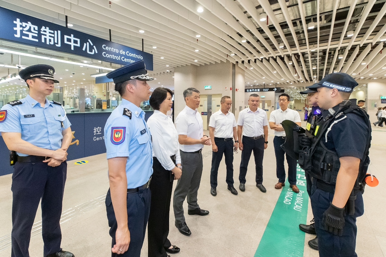 梁文昌局長一行首先前往關閘出入境事務站,視察出入境大堂及酒店接駁巴士區域的運作情況,聽取相關部門主管講解通關實況及國慶黃金周期間的應對部署。梁局長指示相關部門密切關注各口岸人流情況,調配警力支援前線工作,加強與內地邊檢部門的預警聯動,強化出入境口岸的後台保障系統,確保通關流程高效、安全。隨後,梁局長一行轉往青茂出入境事務站,聽取節假日期間防控措施及通關效率匯報。期間,梁局長代表澳門保安司司長向珠海出入境邊防檢查總站領導以及值勤的同事們致以問候。