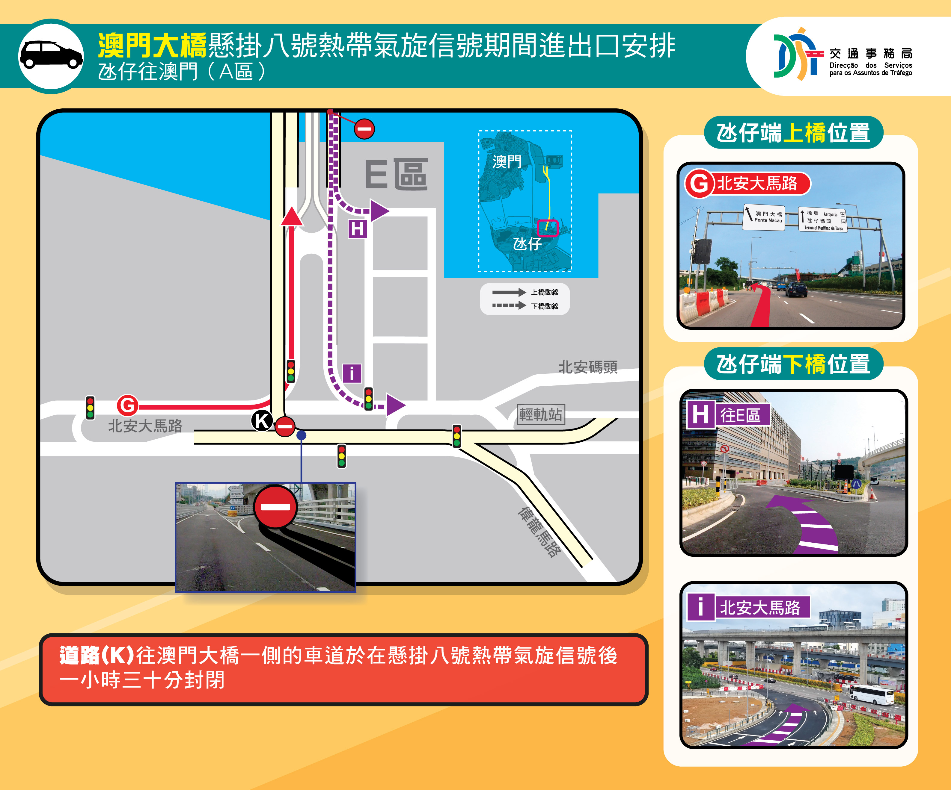 為保障惡劣天氣下市民必要的跨海出行需要,經跨部門協調,特區政府將在8號風球期間,開放澳門大橋供有限度通行(詳情請查閱附表),但如熱帶氣旋的強度、風暴潮水位、降水量及風力等因素構成足以妨害公共安全的風險,民防聯合行動指揮官可隨時禁止輕型客車在澳門大橋通行,敬請市民留意及注意安全。