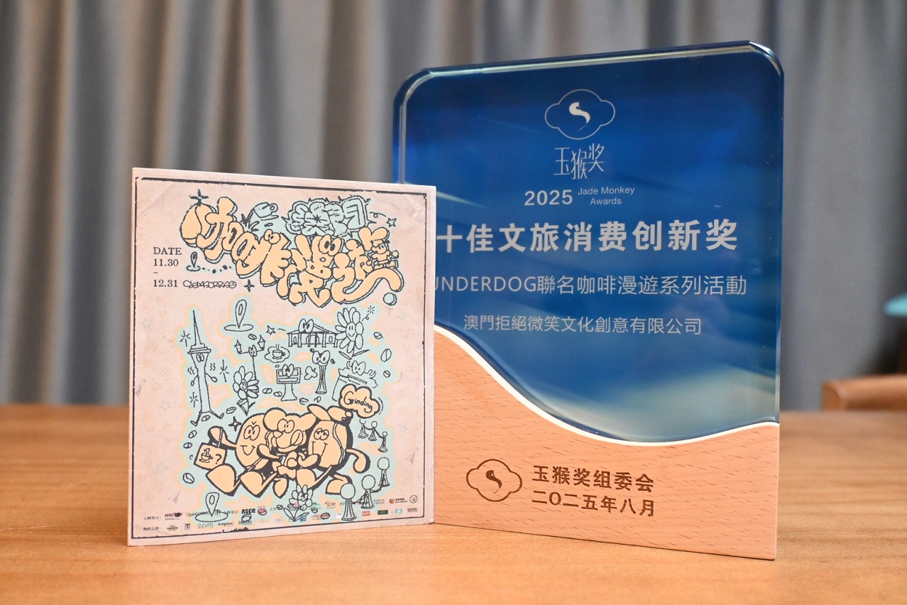 “玉猴獎”創辦於2016年,其命名蘊含“精雕細琢,璞玉成器”之義,是內地第一個以市場價值為評選標準的IP產業獎項。“第八屆玉猴獎中國原創IP盛典”早前於深圳舉行,澳門創意品牌SEM SORRISO(拒絶微笑)旗下的IP UNDERDOG被評選為“2025年度十大最具商業價值潮流藝術IP”,同時憑藉“UNDERDOG 聯名咖啡漫遊系列活動”獲得“2025年度十佳文旅消費創新獎”。