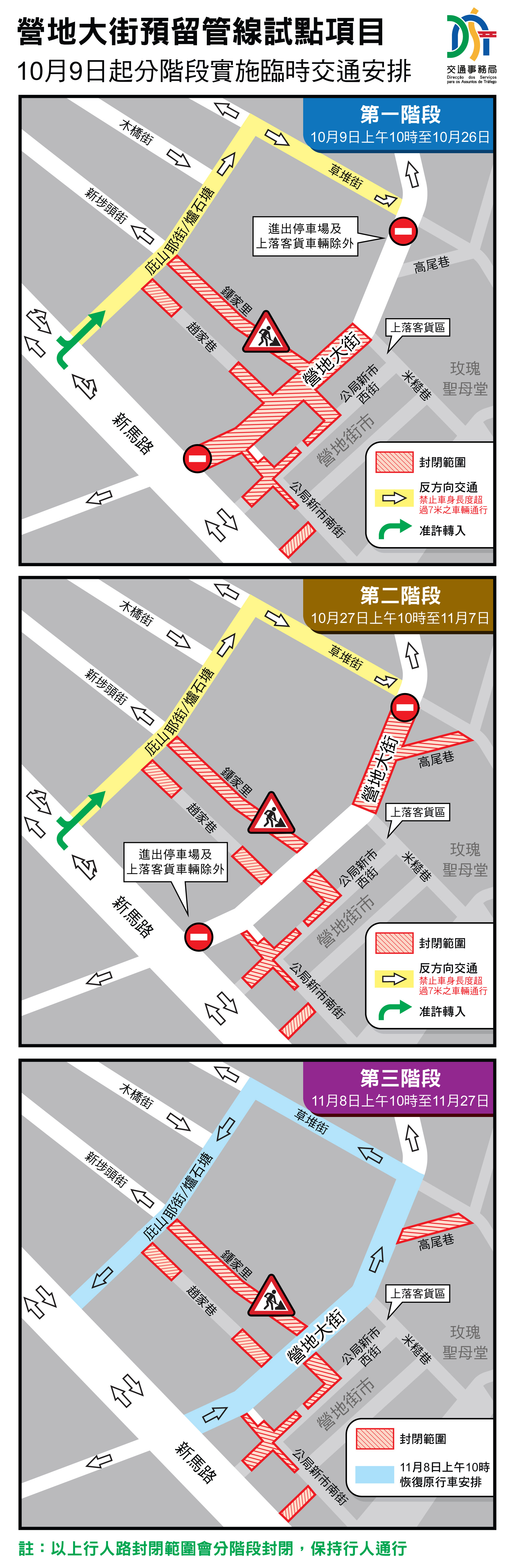 營地大街預留管線試點項目於10月9日起至11月27日進行,為減低影響,經道路工程協調小組(下簡稱“小組”)協調,項目將分3階段進行,其中,第一階段(10月9日起至10月26日)及第二階段(10月27日至11月7日)期間營地大街將分段實施封閉交通,並透過將庇山耶街和草堆街的部份路段改為反向行車,讓車輛能夠到區內上落客貨及進出停車場,保持區內的交通循環,而治安警察局亦會派員指揮交通,維持交通和上落客貨秩序;第三階段(11月8日至11月27日)施工範圍集中在區內的內路,因此,原封閉交通和反方向行車的營地大街、草堆街和庇山耶街將於11月8日上午10時起恢復原有行車安排(具體請查閱附表1及附圖1)。