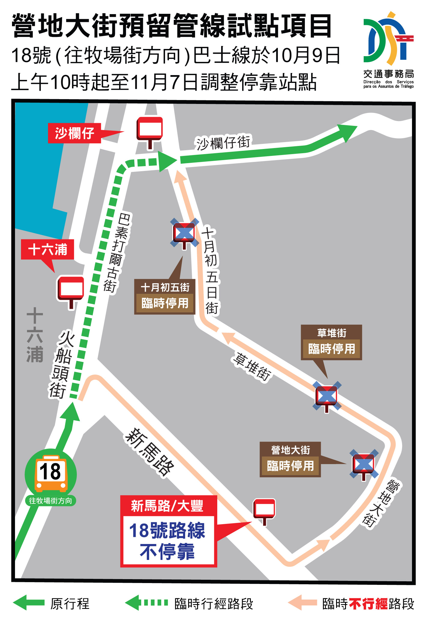 巴士服務方面,18號(往牧場街方向)巴士線於10月9日上午10時起至11月7日臨時不停靠“新馬路/大豐”、“營地大街”、“草堆街”及“十月初五街”巴士站,屆時市民可選用“十六浦”站或“沙欄仔”站上落。詳情可查閱附表2、附圖2或瀏覽澳巴網頁www.tcm.com.mo。