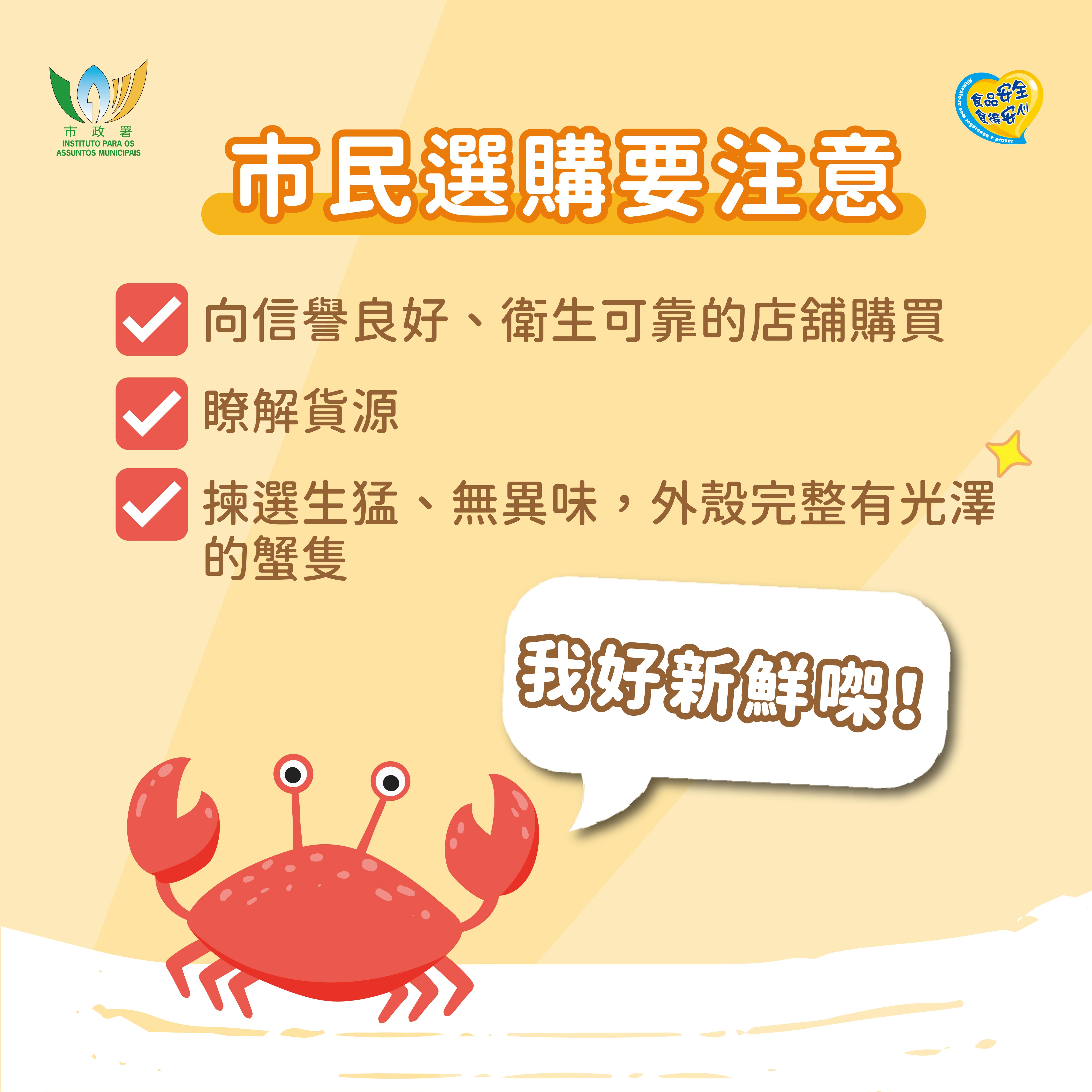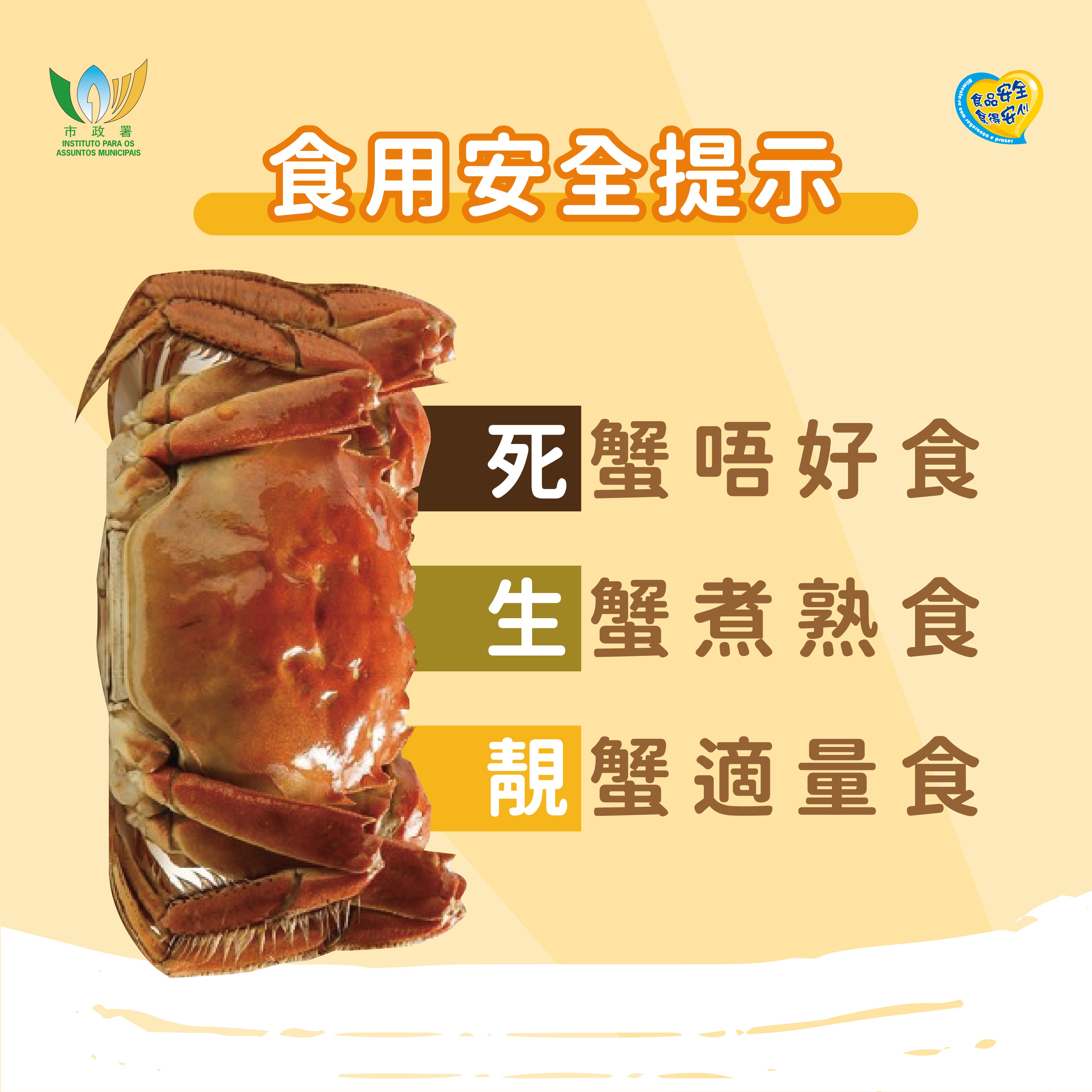市政署已於食品安全資訊網 https://www.iam.gov.mo/foodsafety 設立“秋冬季節食品安全”專頁,提供進食大閘蟹等各類秋冬季節食品的食安提示資訊,歡迎查閱。