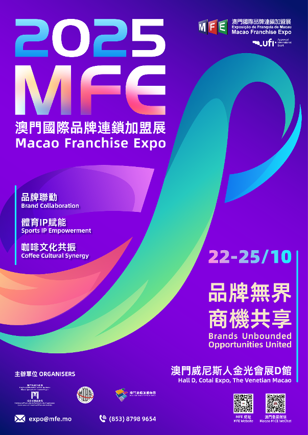 由澳門特區招商投資促進局、澳門連鎖加盟商會、澳門國際品牌企業商會共同主辦的“澳門國際品牌連鎖加盟展2025”(下稱“2025MFE”)將於10月22日至25日(周三至周六)假澳門威尼斯人金光會展舉行。本屆展會有過百個來自中國內地、東南亞等國家及港澳地區的連鎖加盟及IP授權方品牌代理等參展,並設“品牌展區”、“澳門國際咖啡節展區”和“IP授權展區”三大展區,助力業界發掘商機。