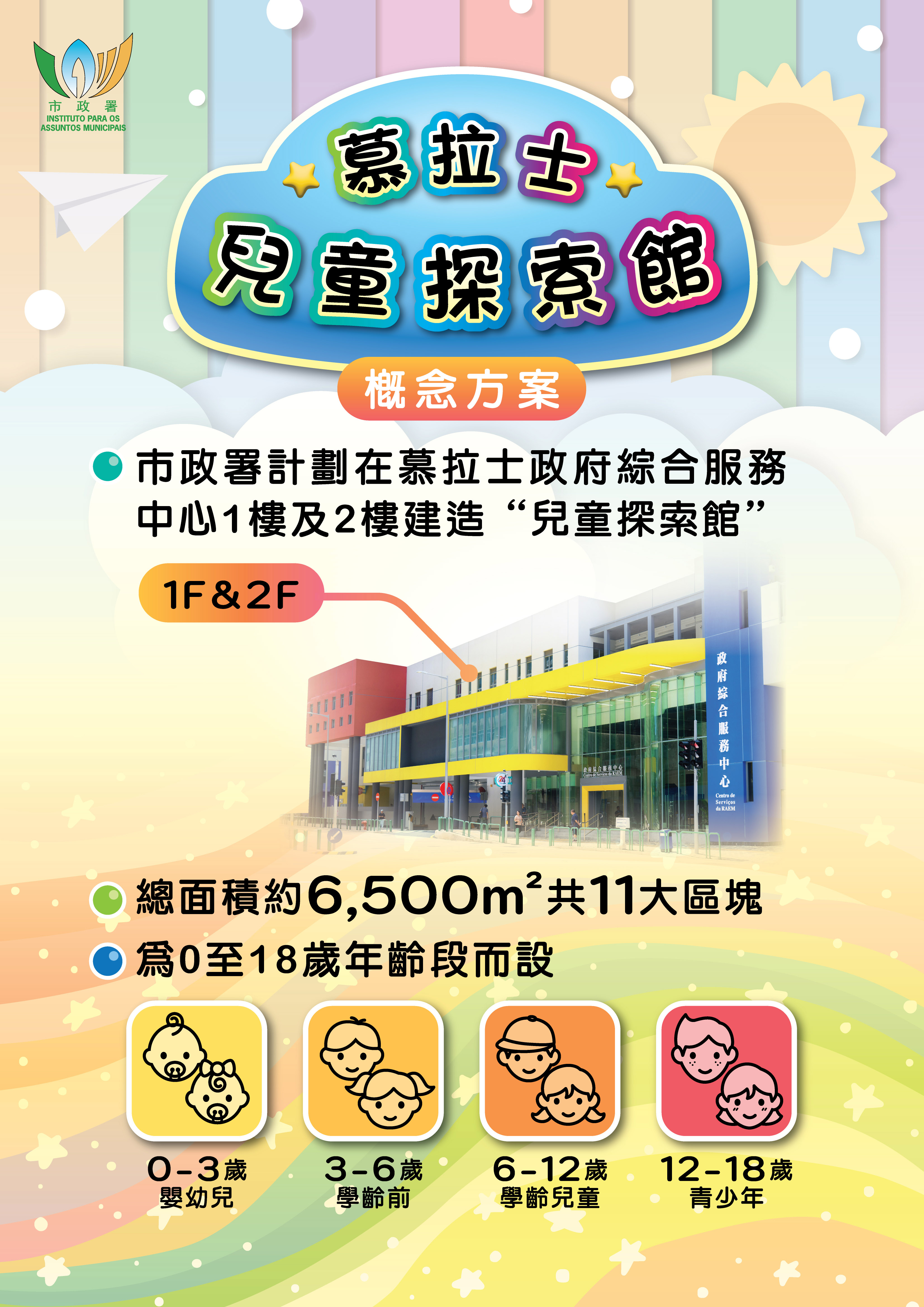 經綜合分析北區人口分佈和特徵、區內對休憩設施的需求,市政署將於剛投入運作的慕拉士政府綜合服務中心建造面積約6,500平方米的兒童探索館,以啟發創造力,培養探索精神為目標,為本澳兒童及青少年創設新穎、多元、益智的全天候遊樂空間。計劃於2026年啟動設計,爭取2027年展開工程公開招標工作,2028年第四季完工。