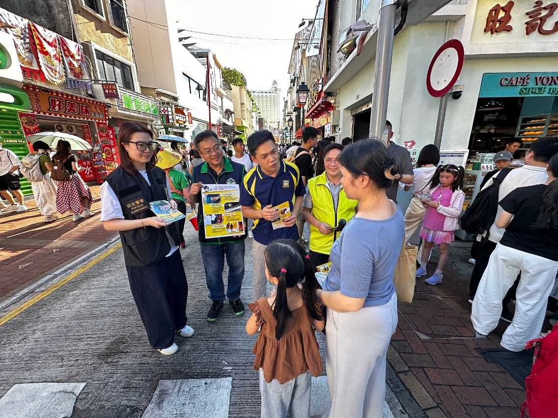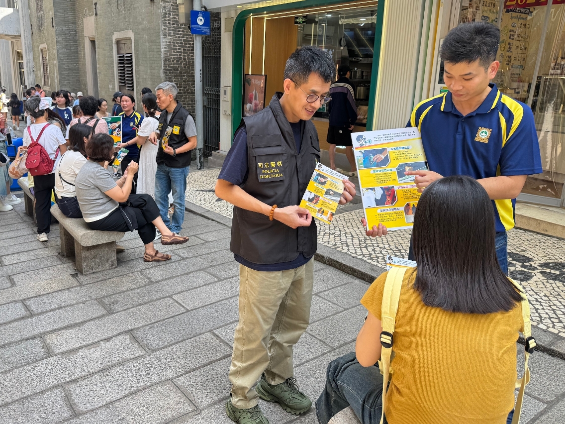 國慶長假期為訪澳旅客的高峰期,各旅遊區人流密集,不法分子往往伺機進行盜竊等犯罪活動。為提高市民及旅客對盜竊罪案的警惕意識與防罪能力,司法警察局派員聯同“司警局大廈防罪之友”成員展開防罪宣傳,向市民及旅客講解防盜須知,以有效預防盜竊案件發生。