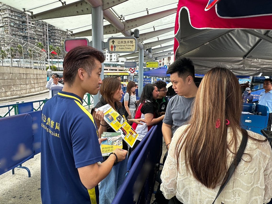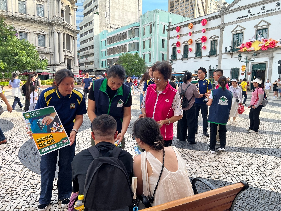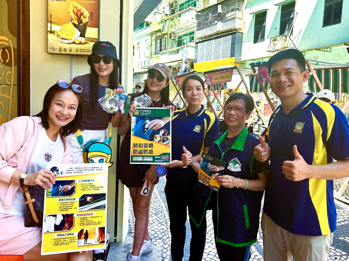9月29日至10月10日期間,司警局第二統籌科及防止罪案科人員聯同澳門街坊會聯合總會、澳門工會聯合總會、澳門婦女聯合總會、澳門歸僑總會及民眾建澳聯盟等已加入“司警局大廈防罪之友”的社團成員,先後前往本澳的口岸、酒店穿梭巴士站點、旅遊熱點及人流密集區域,向市民和旅客派發防盜資訊及報案程序宣傳單張,並詳細講解各項防盜措施。司警局人員提醒市民和旅客,應時刻妥善保管隨身物品,手袋背包應放在身前並拉好拉鏈,避免隨身攜帶大量現金,貴重物品亦應分開存放,切記“財不可露眼”;在人多擠迫的地方及乘坐公共交通工具時,應將財物保持在視線範圍內,並留意身邊是否有可疑人士刻意靠近或製造碰撞。司警局人員亦向他們介紹報案程序,呼籲如遇可疑情況或不幸被盜,應立即報警求助。