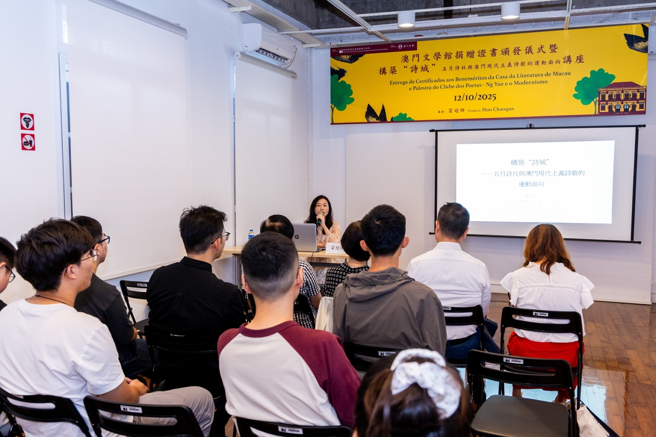 文化局持續深化澳門與大灣區城市的文化交流,搭建更廣闊的創作與展演平台,推動文學、戲劇及文化表演的跨界融合,頒贈儀式當日同時舉辦“構築‘詩城’——五月詩社與澳門現代主義詩歌的運動面向”講座,由澳門科技大學國際學院講師霍超群主講,吸引眾多市民參與,反應熱烈。霍超群在講座中聚焦五月詩社如何在多元文化背景下,融合不同詩意追求,構築獨特的“詩城”文學理想;探討詩社成員在“鼓勵創作”與“追求先鋒”之間的辯證關係,以及他們如何回應澳門城市現代性帶來的文化命題。