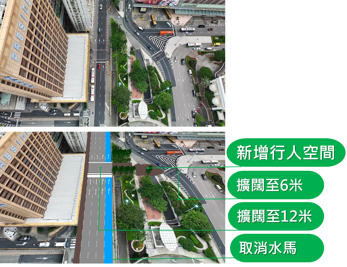 配合是次改造工程,藝園近友誼大馬路一側人行橫道擴闊至12米,而近仙德麗街一側的人行橫道擴闊至6米,為行人提供舒適的步行環境橫越友誼大馬路及仙德麗街,另外,工程亦一併取消友誼大馬路近藝園的水馬以實施四線行車,優化友誼大馬路的行車環境,請駕駛者留意現場的交通調整。