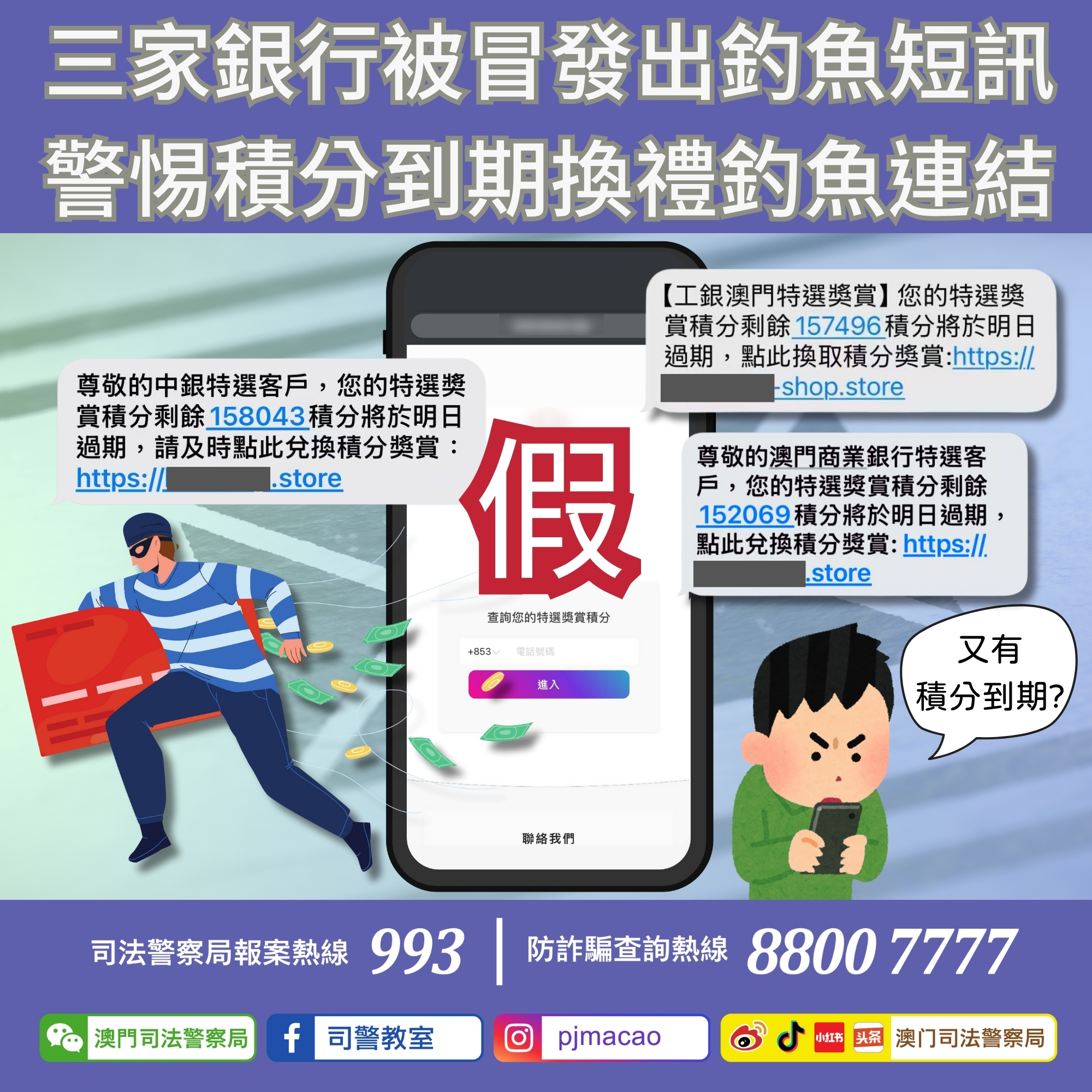 近日,司法警察局發現騙徒先後冒充本澳三家銀行,包括工銀澳門、澳門商業銀行及澳門中銀的名義,向市民濫發釣魚短訊。內容以「特選獎賞積分明日過期」為由,誘使市民點擊短訊內附帶的釣魚連結。由於騙徒的釣魚短訊有可能會混入市民與銀行的真實短訊對話框內,市民務必提高警覺。