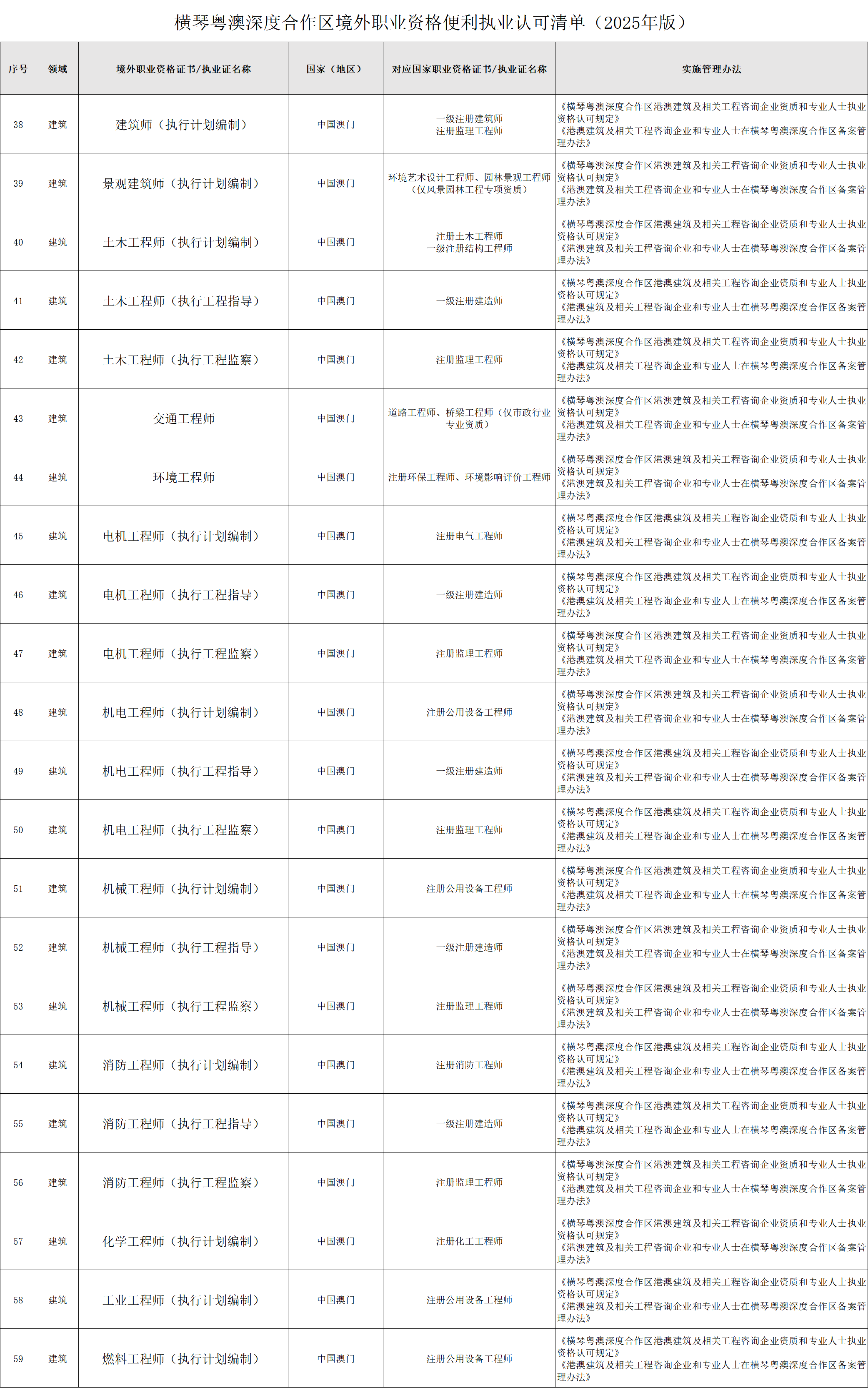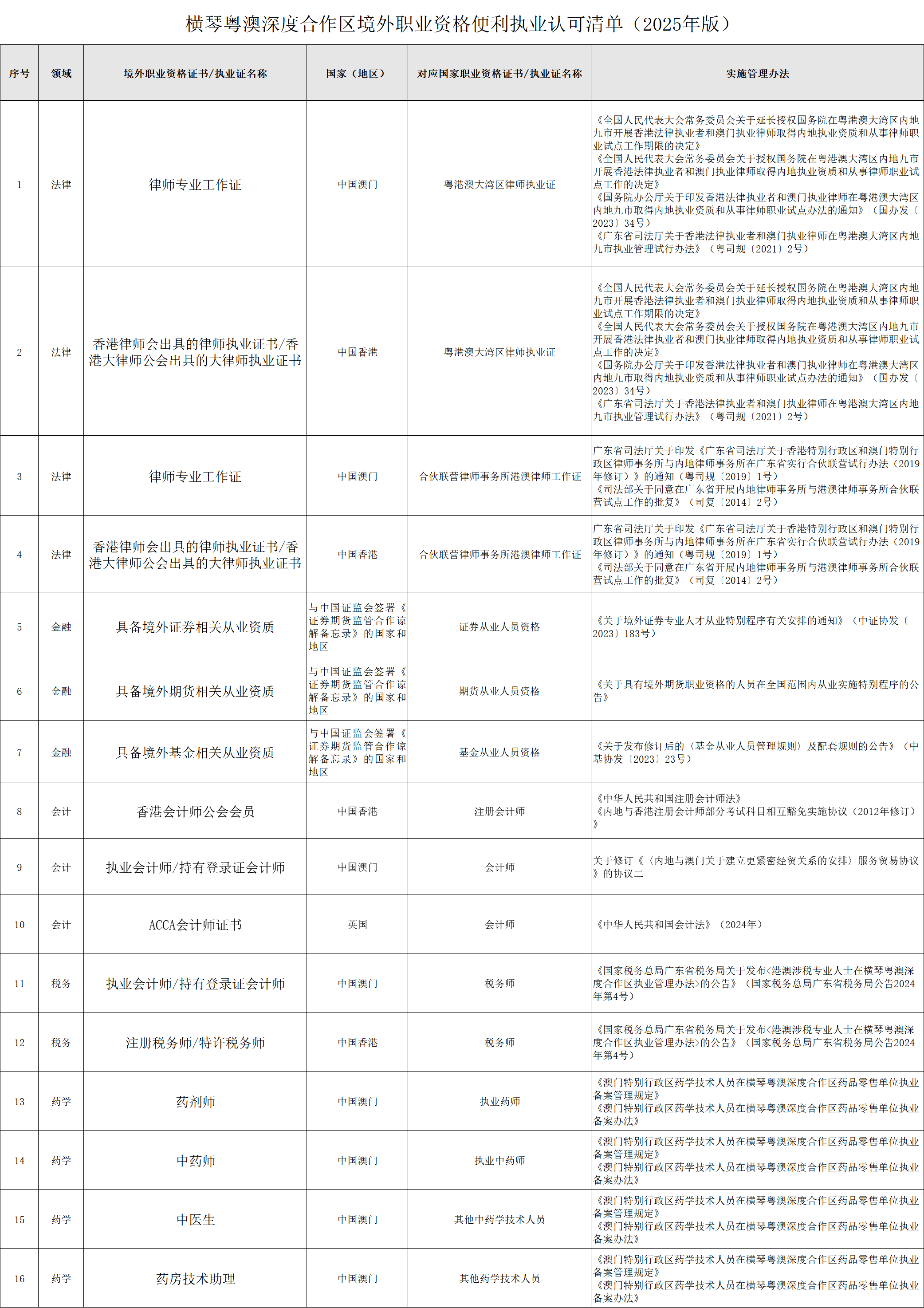 近日,橫琴粵澳深度合作區經濟發展局發佈《橫琴粵澳深度合作區境外職業資格便利執業認可清單(2025年版)》(下稱《清單》),允許持有《清單》內境外職業資格的專業人員按照相關實施辦法,通過執業備案、登記、專業科目免考等途徑,在合作區提供專業服務。《清單》的發佈是合作區與澳門規則銜接的重要體現,助推人才創新要素跨境流動,為琴澳一體化發展提供人才支撐。