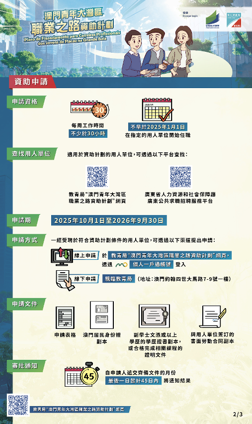 由教育及青年發展局與勞工事務局合作推出的“澳門青年大灣區職業之路資助計劃”現正接受申請,歡迎符合條件且有意投身粵港澳大灣區發展的澳門青年把握機遇,踴躍申請。