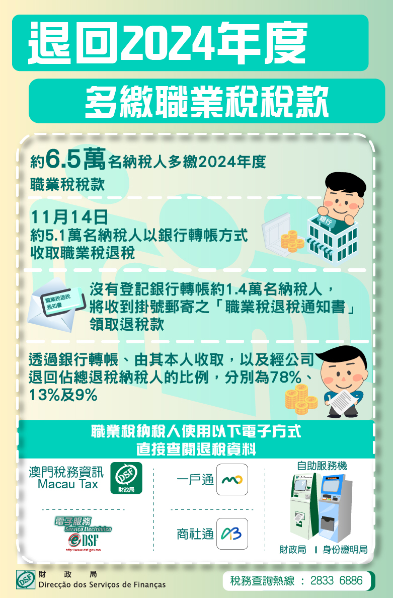 職業稅納稅人於11月1日起已可透過財政局移動應用程式“澳門稅務資訊Macau Tax”、“一戶通”、“商社通”、財政局“電子服務”,以及財政局和身份證明局的自助服務機,查閱2024年度多繳職業稅的退稅資料。