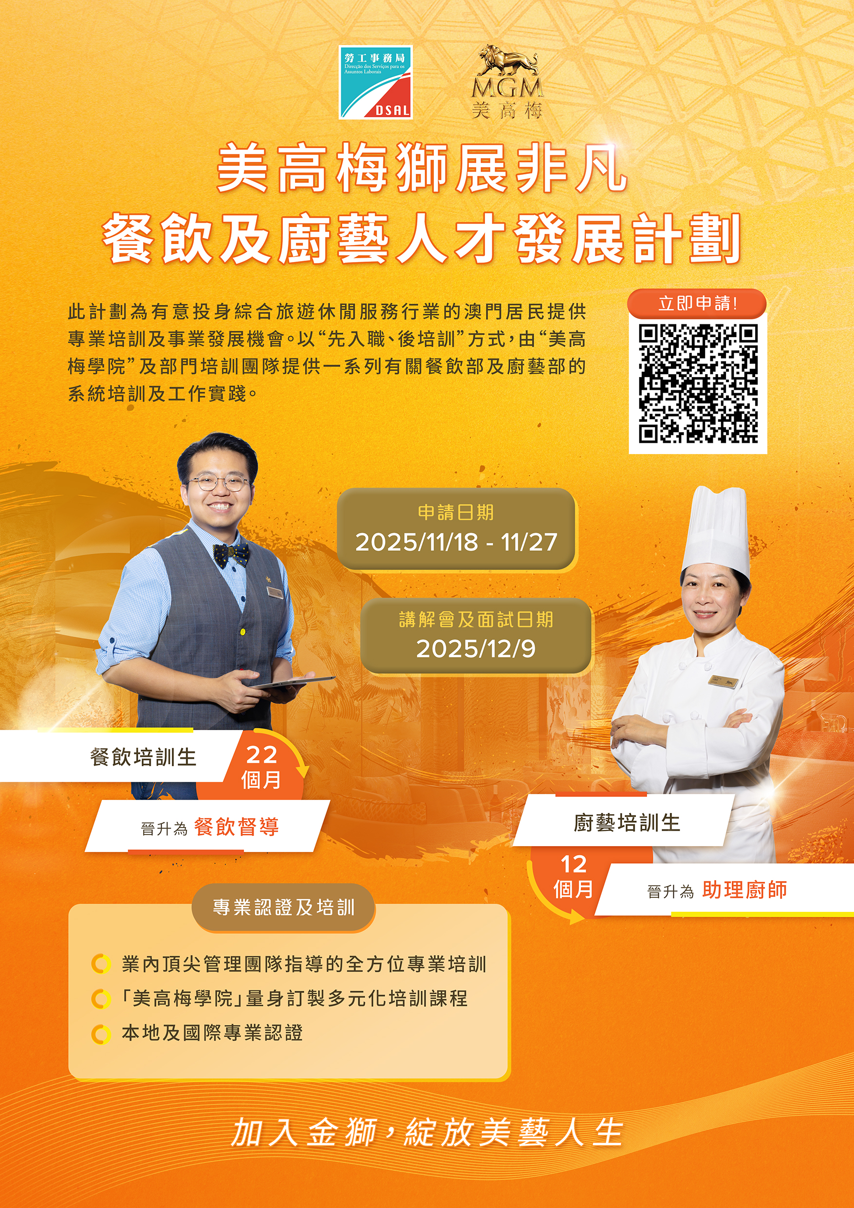 為促進本地人才職業發展,勞工事務局(下稱“勞工局")和美高梅金殿超濠股份有限公司(下稱“美高梅”)合作推出“美高梅獅展非凡餐飲及廚藝人才發展計劃”(下稱“計劃”),以“先入職、後培訓”方式,為本澳居民提供專業培訓及工作實踐,計劃由明(18)日起接受申請。