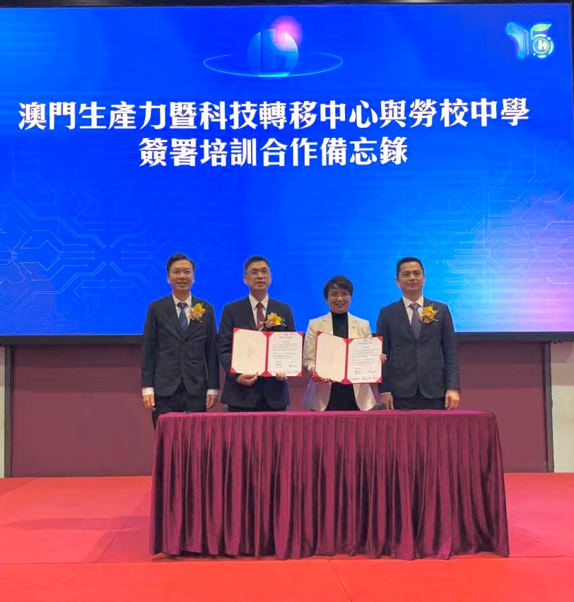 生產力中心理事長關治平與勞校中學校長鄭杰釗,在教育及青年發展局處長梁怡安及華為澳門公司副總經理朱志華的見證下,共同簽署培訓合作備忘錄。勞校中學於本學年的高中年級增設了華為人工智能(HCIA-AI)課程,課程內容涵蓋機器學習、深度學習及大模型基礎等核心知識,並結合華為的人工智能平台進行實操,協助學生掌握AI理論及應用能力,為其升學及職業發展奠定基礎。