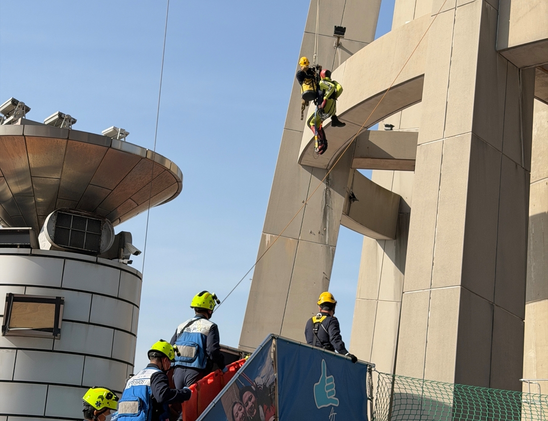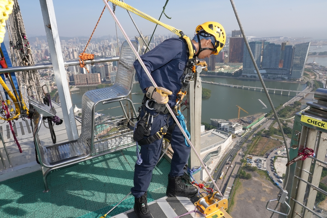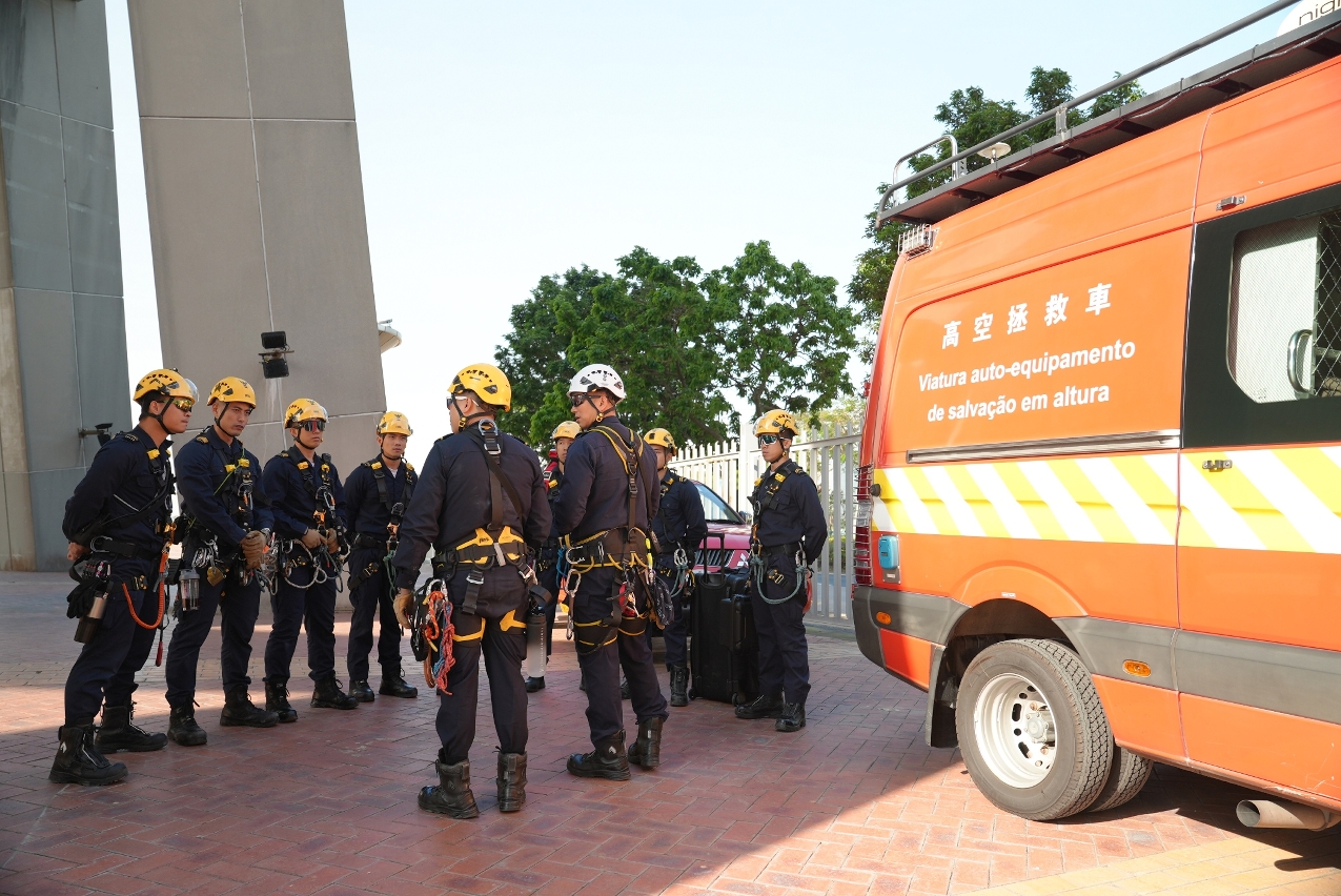 為提升消防局人員在高空拯救工作上的技術水平和應變能力,以及加強與澳門旅遊塔在遇突發事件時的溝通協調,於2025年11月26日上午,雙方在澳門旅遊塔舉行高空拯救演習。