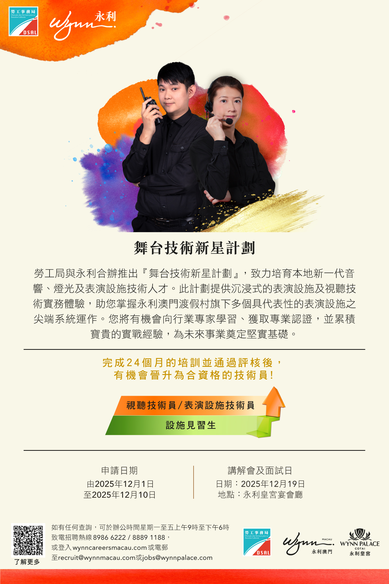 為促進本地人才職業發展,勞工事務局(下稱“勞工局")和永利澳門有限公司(下稱“永利")合作推出“舞台技術新星計劃",以“先入職、後培訓"方式,為本澳居民提供專業培訓及工作實踐機會,即(1)日起接受申請。