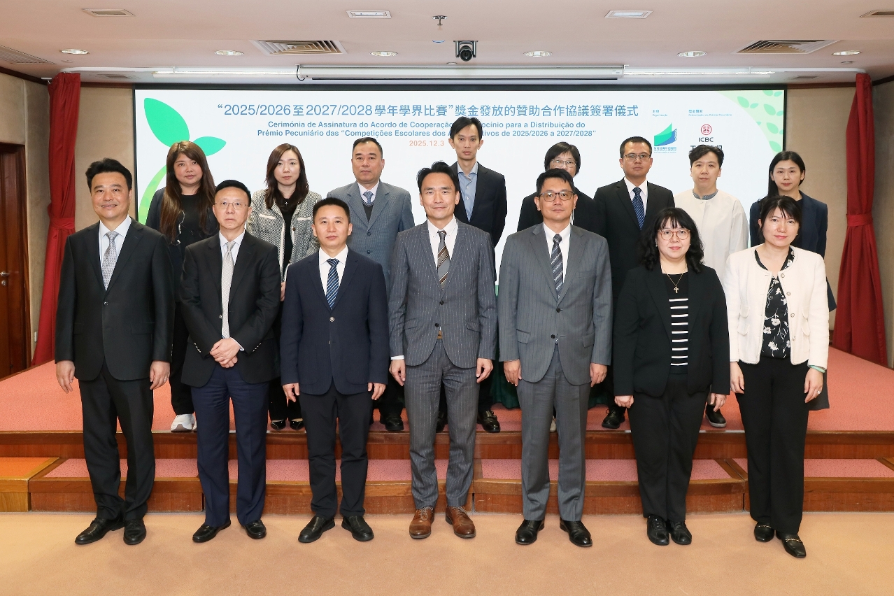 教青局於12月3日舉行2025/2026至2027/2028學年學界比賽獎金發放的贊助合作協議簽署儀式。在社會文化司司長代表、教青局局長龔志明,中央人民政府駐澳門特別行政區聯絡辦公室教育與青年工作部副部長李勇先,中國工商銀行(澳門)股份有限公司董事長盧建的見證下,教青局副局長阮佩賢中國工商銀行(澳門)股份有限公司副行政總裁黃獻軍簽署合作協議。