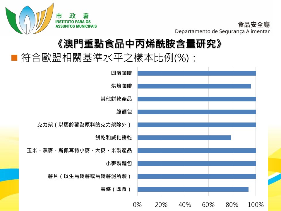 結果顯示,超過百分之95.7食品樣本符合歐盟為特定食品訂立的丙烯酰胺含量基準水平,當中,即溶咖啡粉、薯片薯條、油炸馬鈴薯、紅糖和烤馬鈴薯的丙烯酰胺含量較高。是次研究亦對本地生產、加工或包裝的食品樣本作獨立分析,結果顯示超過百分之98.4符合上述基準,反映在本澳巿面抽取的相關食品樣本普遍處於歐盟控制特定食品中丙烯酰胺含量的基準。