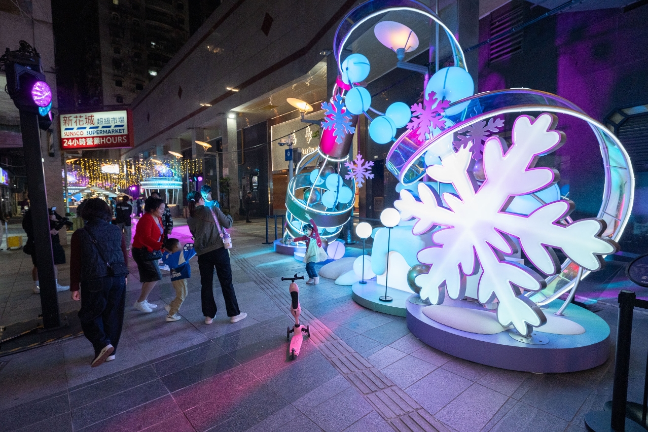新口岸區打造“鎏光・派對”,在高美士街、廈門街和長崎街一帶設置多款特色裝置。澳門插畫師協會在該區帶來《雲朵星河》燈飾裝置,運用雲朵與星星打造一條流動閃爍的星河,提供可放緩腳步欣賞本土藝術與文創設計的空間氛圍。