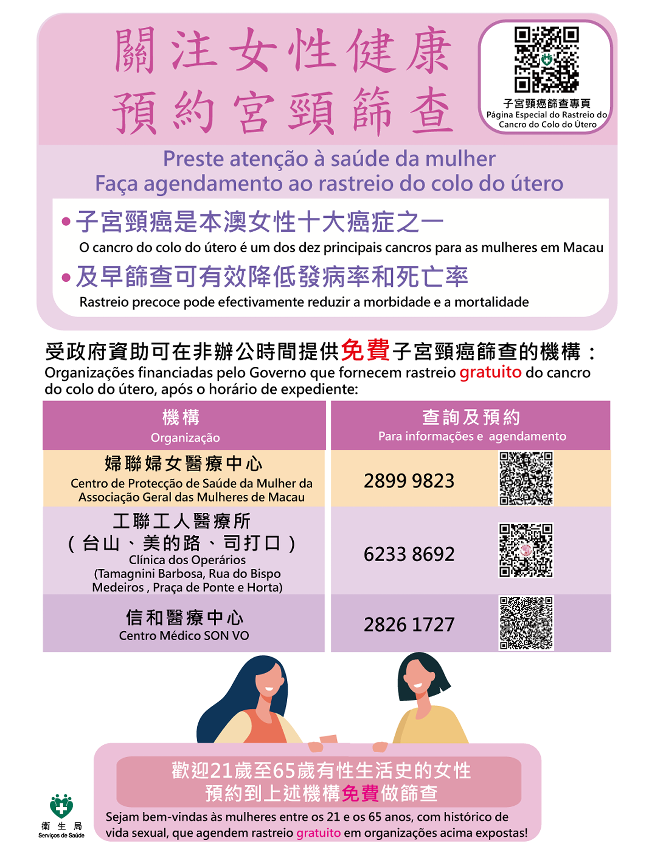 衛生局表示,乳腺癌和子宮頸癌為澳門女性常見的癌症,早期症狀多不明顯,難以察覺,定期篩查可及早發現癌前病變或早期癌症,實現“早預防、早發現、早診治”的目標,大幅提升治療效果及存活率,降低癌症死亡風險。居民可通過“一戶通”內“我的健康”的“綜合癌症篩查平台”進行風險評估,系統會根據個人的年齡、性別和問卷評估結果等,提出個體化的癌症篩查建議,並可在“平台”實現一站式預約子宮頸癌、大腸癌、乳腺癌和肺癌等主要癌症篩查服務及獲取更多相關資訊。而保持健康生活方式,包括健康飲食、規律運動、戒煙限酒及充足睡眠等,可有效降低罹患各類癌症的風險。
