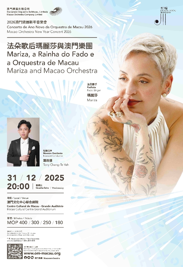 澳門樂團2026新年音樂會《法朵歌后瑪麗莎與澳門樂團》,將於12月31日晚上8時在澳門文化中心綜合劇院舉行。瑪麗莎將聯袂交響樂團現場演唱,以穿透靈魂的嗓音,演繹多首法朵名作,為觀眾帶來一場跨越音樂類型與時空界限的藝術饗宴。
