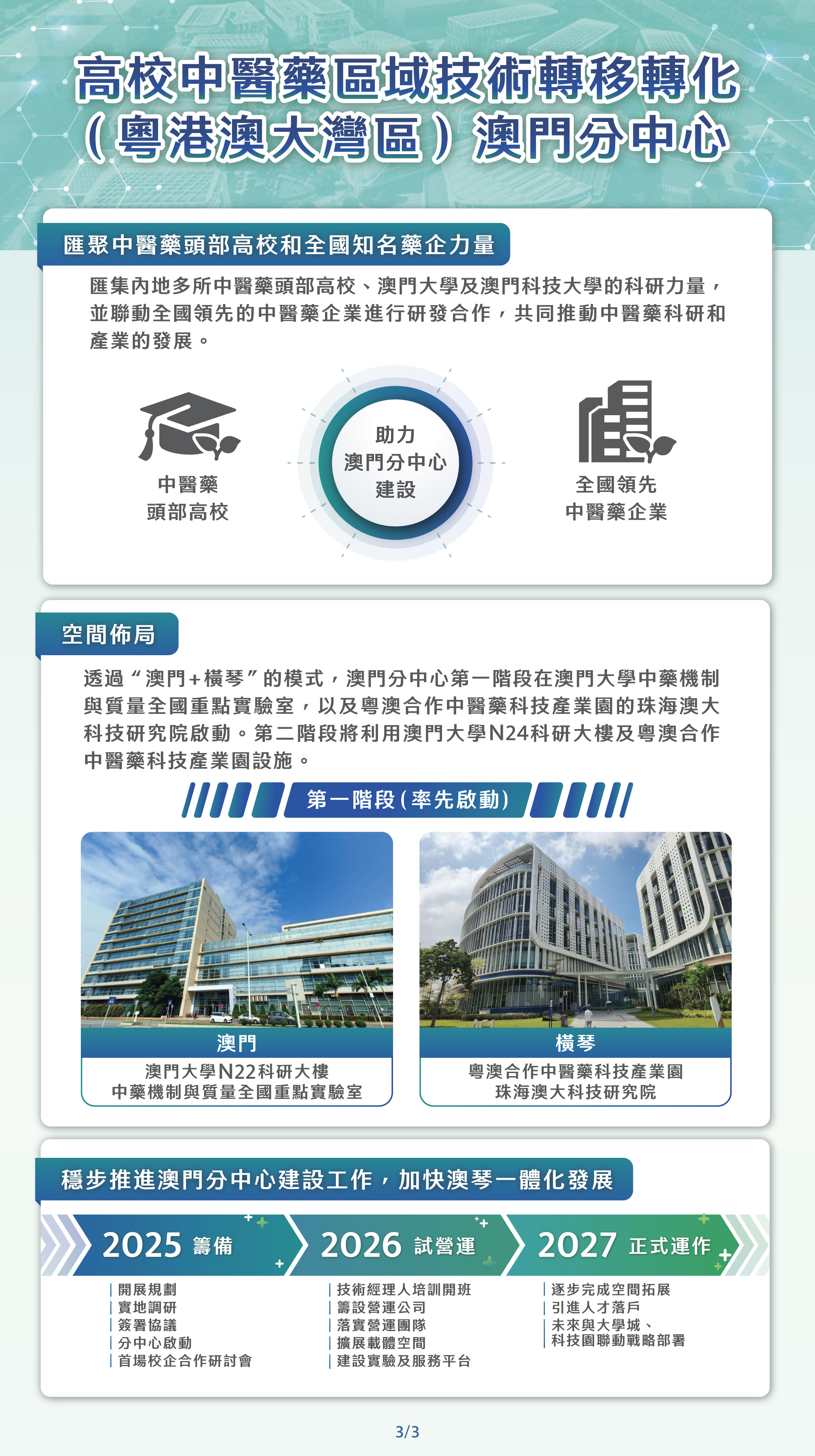 同時,回應國家教育部提出以“中心+節點”高校科技成果轉化體系的全國高校區域技術轉移轉化中心,加速創新成果的集聚與轉化,積極籌建高校中醫藥區域技術轉移轉化(粵港澳大灣區)澳門分中心,連結內地與澳門中醫藥頭部高校的科研團隊和企業,並善用澳門高校全國重點實驗室和合作區珠海澳大科技研究院等科技平台,建設服務與實驗平台,聯動政、產、學、研、金的力量,全力支援中醫藥大健康產業發展,實現科研成果從“書架走到貨架”,並以“澳門註册+横琴生產”模式,推動優質的中藥產品進入國際市場,全球銷售。