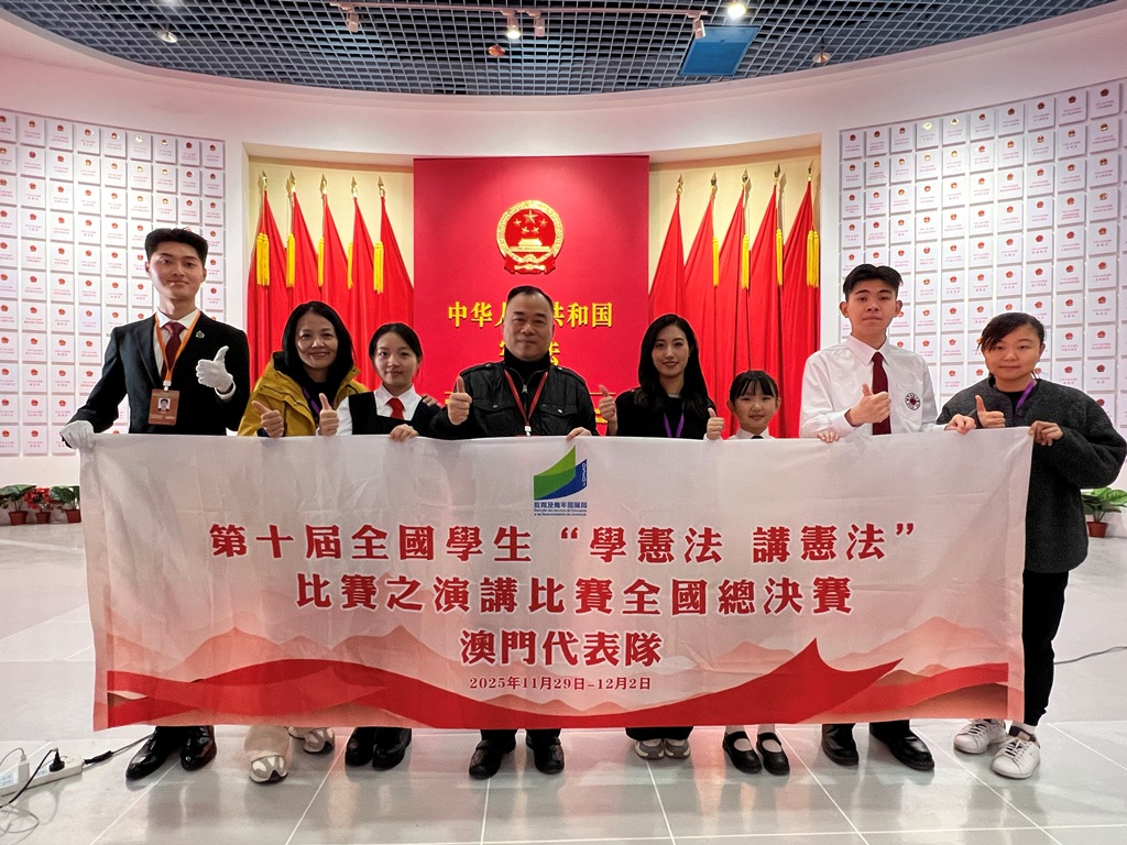 為加強青少年學生的憲法法治教育,普及憲法法治知識,培育憲法法治觀念,弘揚憲法法治精神,教育及青年發展局組織澳門代表隊參加由國家教育部於2025年舉辦的第十屆全國學生“學憲法 講憲法”比賽之演講比賽和大中小學法治情景劇比賽兩項賽事,獲得優異成績。