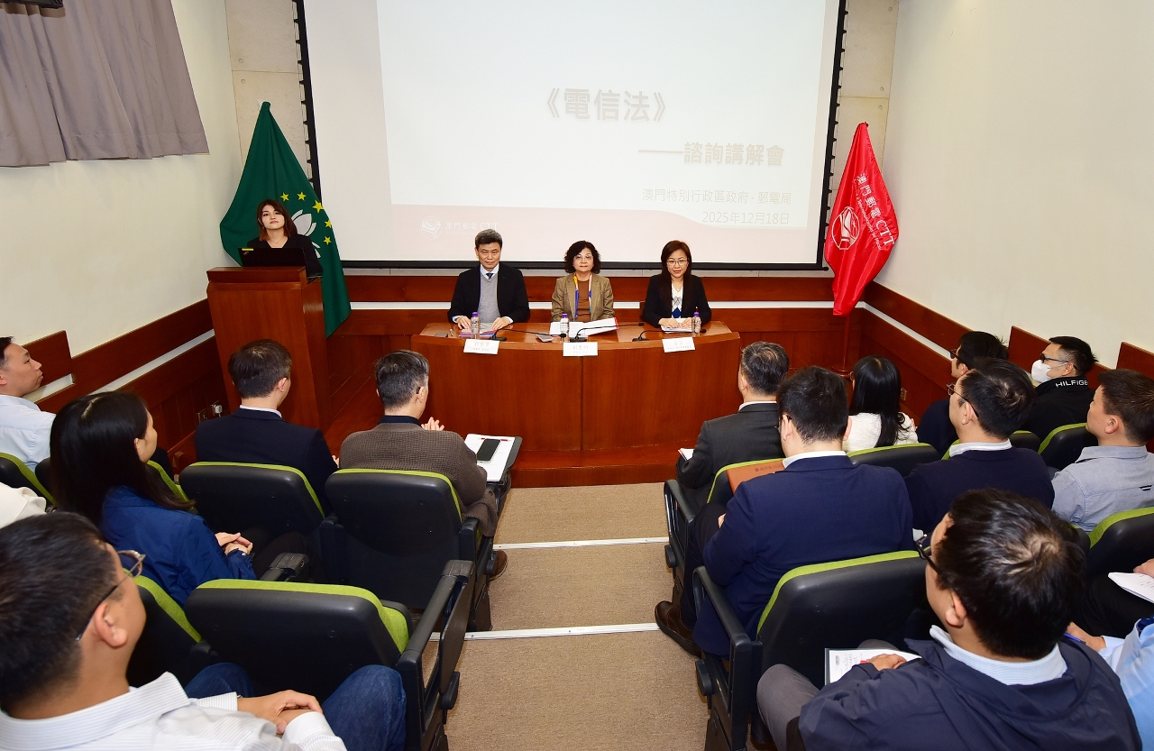 為配合通訊技術快速發展及社會經濟數字化轉型,澳門特別行政區政府正積極推進《電信法》的立法工作。為進一步完善法案框架內容,郵電局於2025年12月4日至2026年1月2日期間,展開為期三十日的業界諮詢,並於今日(12月18日)舉行兩場業界諮詢講解會,由郵電局劉惠明局長及相關主管人員主持,向業界代表、專業團體及政府部門詳細介紹法案內容,聽取各方寶貴意見。