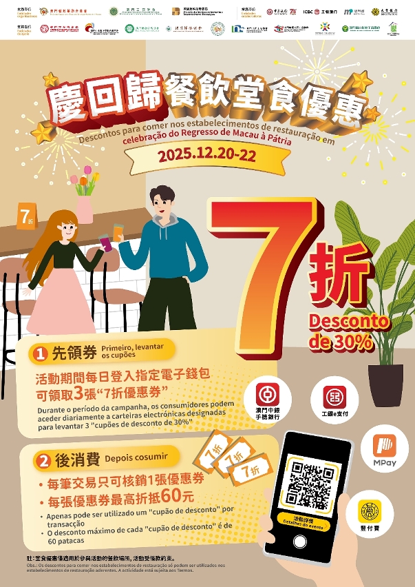 為慶祝澳門回歸祖國26周年及提振社區消費活力,特區政府聯同澳門餐飲業聯合商會及澳門工商聯會,自明(20)日起連續3日推出“慶回歸餐飲堂食優惠"。居民領取活動優惠券後,透過指定移動支付工具付款,即可於全澳超過500間餐飲商戶享受堂食7折堂食消費優惠。