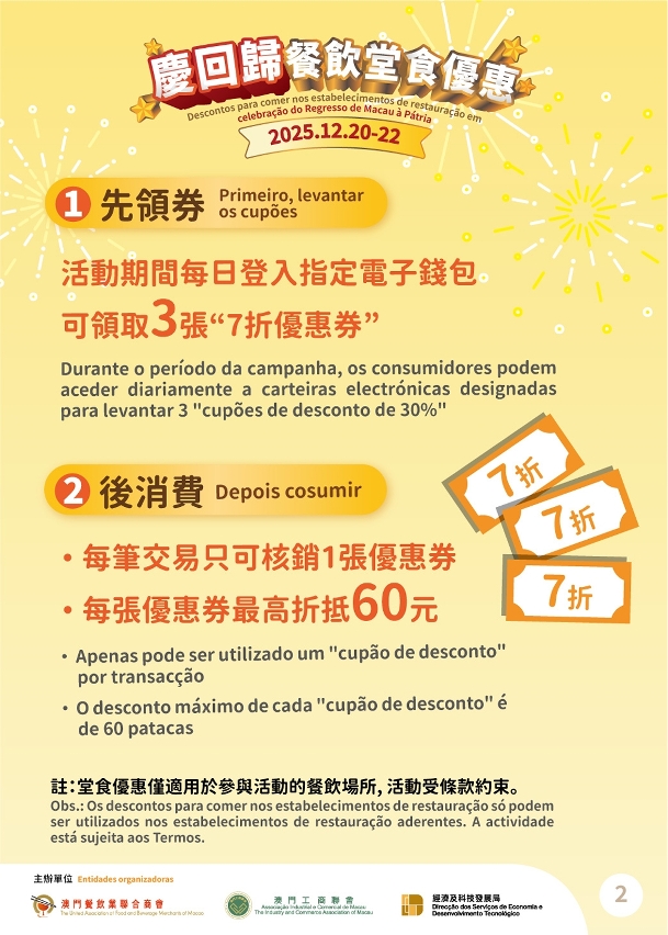 優惠活動於12月20日至22日期間推出。居民可透過4間合作的移動支付工具手機應用程式領取7折堂食餐飲消費優惠券。參與活動的餐廳超過500間,覆蓋本澳不同社區,攜手帶動節慶假日的消費活力。為精準支援中小企商戶,是次活動不包括綜合旅遊休閒企業設施內的餐飲場所。