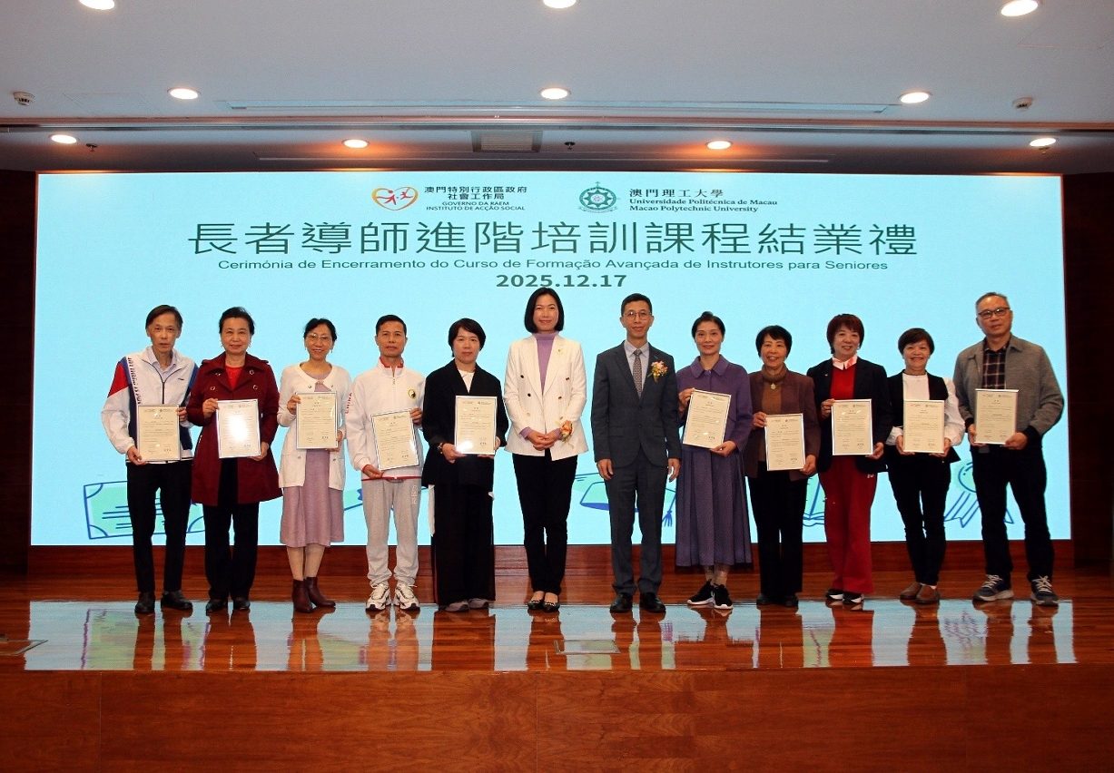 由社會工作局與澳門理工大學長者書院合辦的“長者導師進階培訓課程”,於12月17日在澳門理工大學舉行結業禮,一眾長者學員完成課程並獲發結業證書。