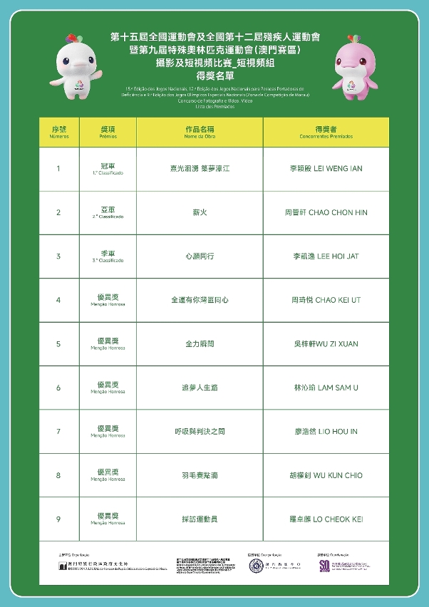為響應“第十五屆全國運動會及全國第十二屆殘疾人運動會暨第九屆特殊奧林匹克運動會(澳門賽區)”(下稱“十五運會及殘特奧會”)在澳門特別行政區舉辦賽事,由文化局與十五運會及殘特奧會澳門賽區籌備辦公室聯合主辦、澳門攝影學會協辦的“十五運會及殘特奧會”攝影及短視頻比賽已圓滿結束,比賽收到約200份參賽作品,經評審團評選,現公佈冠軍、亞軍、季軍及優異獎得獎名單。