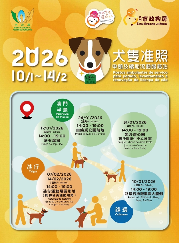 為便利飼主辦理犬隻准照申領及續期,市政署將於2026年1月10日至2月14日期間,在本澳各區設置“犬隻准照申領及續期流動服務站”,同場提供狂犬病疫苗注射及寵物領養查詢服務,宣揚預防狂犬病及領養代替購買。