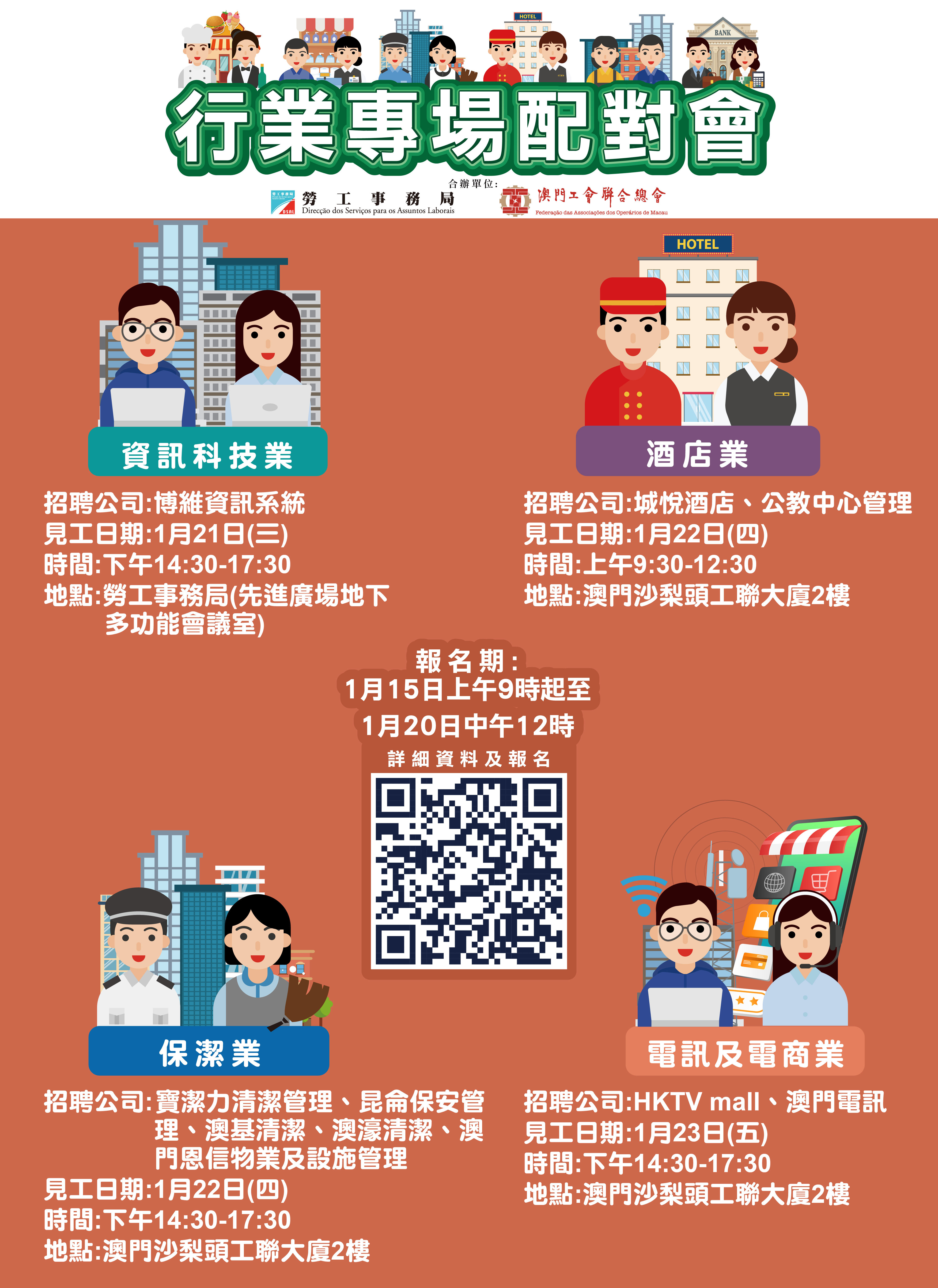 1月21日下午資訊科技業專場配對會在澳門馬揸度博士大馬路221-279號先進廣場地下勞工局多功能會議室舉行;1月22日上午酒店業專場配對會、1月22日下午保潔業專場配對會和1月23日下午電訊及電商業專場配對會,均在澳門沙梨頭海邊街2-6號工聯大廈二樓舉行。報名日期均由明(15)日上午9時起至1月20日中午12時。