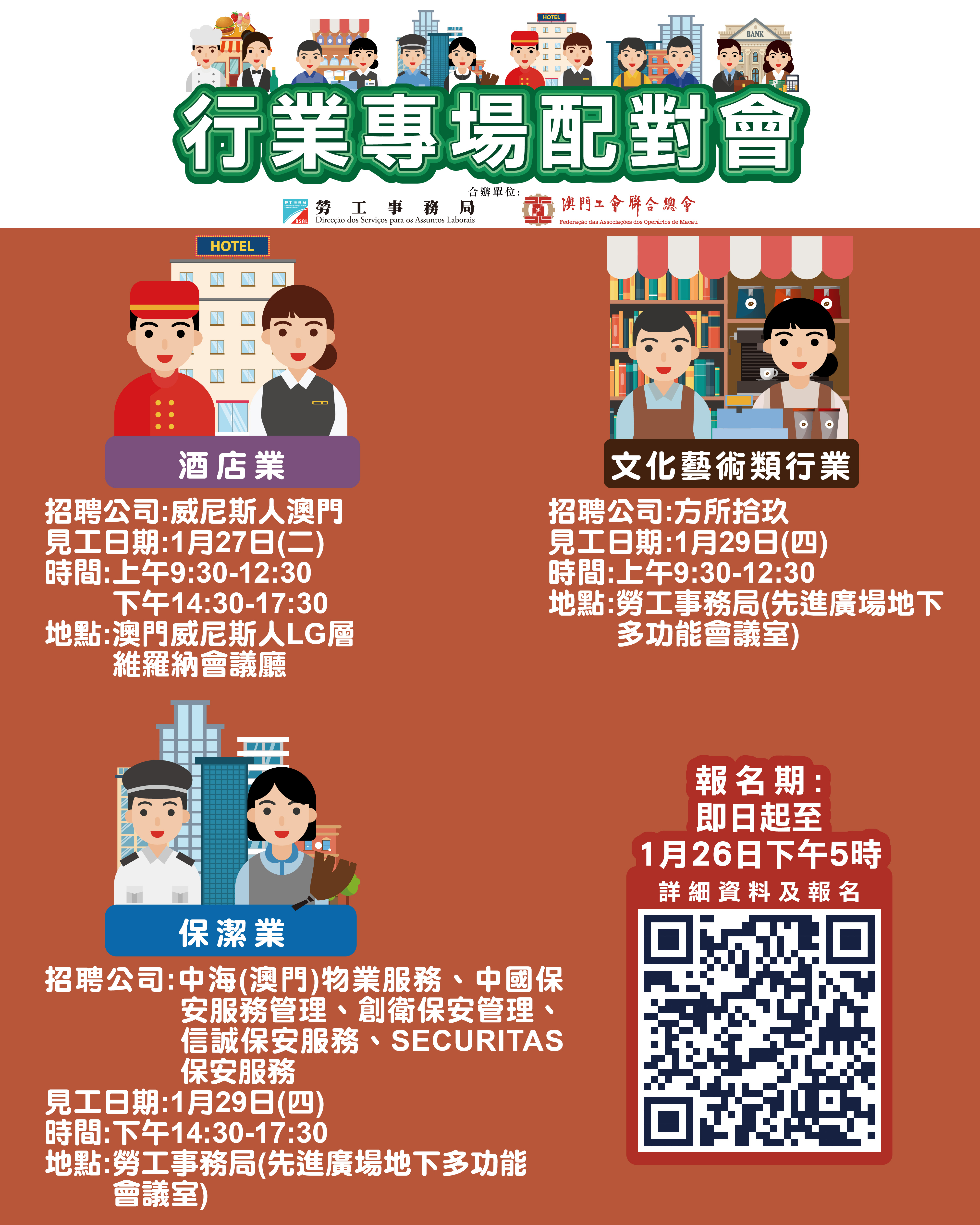 1月27日全日酒店業專場配對會在澳門威尼斯人LG層維羅納會議廳舉行;1月29日上午文化藝術類行業專場配對會及同日下午保潔業專場配對會在澳門馬揸度博士大馬路221-279號先進廣場地下勞工局多功能會議室舉行。報名日期均由即日起至1月26日下午5時。