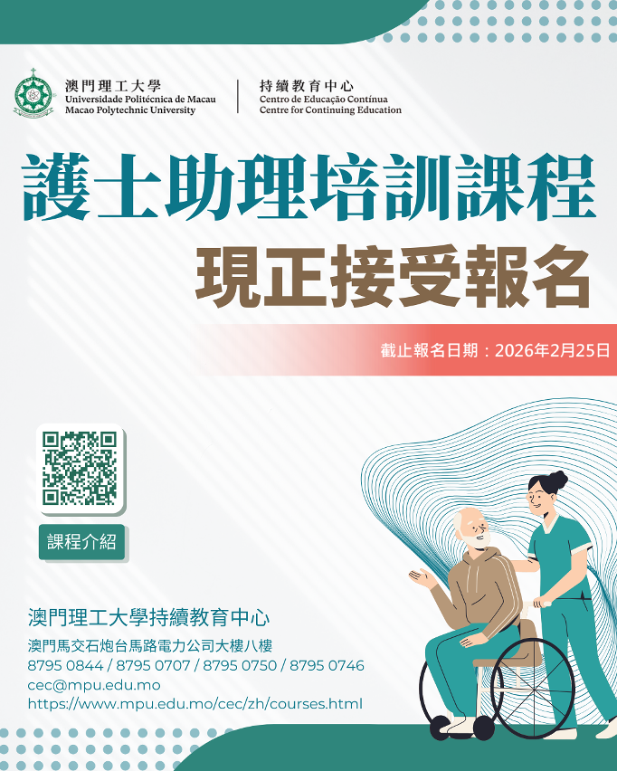 為配合澳門醫療機構及院舍需要,培訓護士助理的知識和技能,以保障照顧服務素質,澳門理工大學持續教育中心將於 2026年3月開辦第三屆“護士助理培訓課程課程”,對象為具高中畢業或以上學歷的澳門居民,具備醫療護理機構健康照顧人員工作經驗者優先。