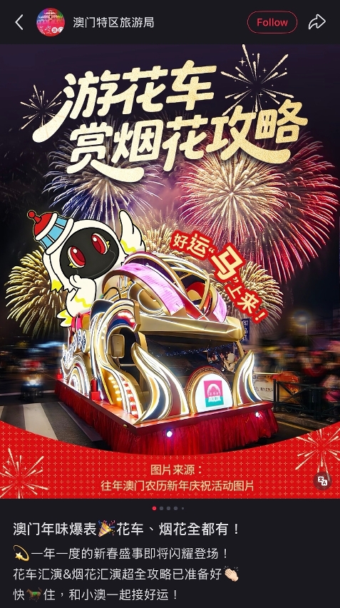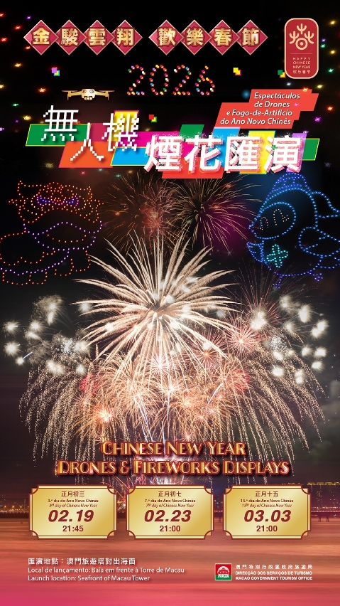旅遊局精心準備三項獲國家文化和旅遊部納入“歡樂春節”框架的大型賀歲活動,包括“歡樂春節─2026年龍騰舞躍賀新春”社區巡演、“駿馬騰飛 歡樂春節 2026農曆新年花車匯演”及“金駿雲翔 歡樂春節”2026無人機煙花匯演,與居民及旅客共慶佳節,盡展澳門“旅遊+盛事”多元魅力。