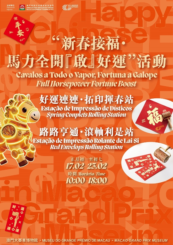 旅遊局轄下的澳門大賽車博物館將在2月17至23日舉行“新春接福‧馬力全開『啟』好運”活動,訪客可快閃製作揮春與利是封,增添喜慶氛圍;精品廊自即日起至3月31日推出新春及元宵節優惠,更設有優惠禮品包,部分商品以七折優惠出售。