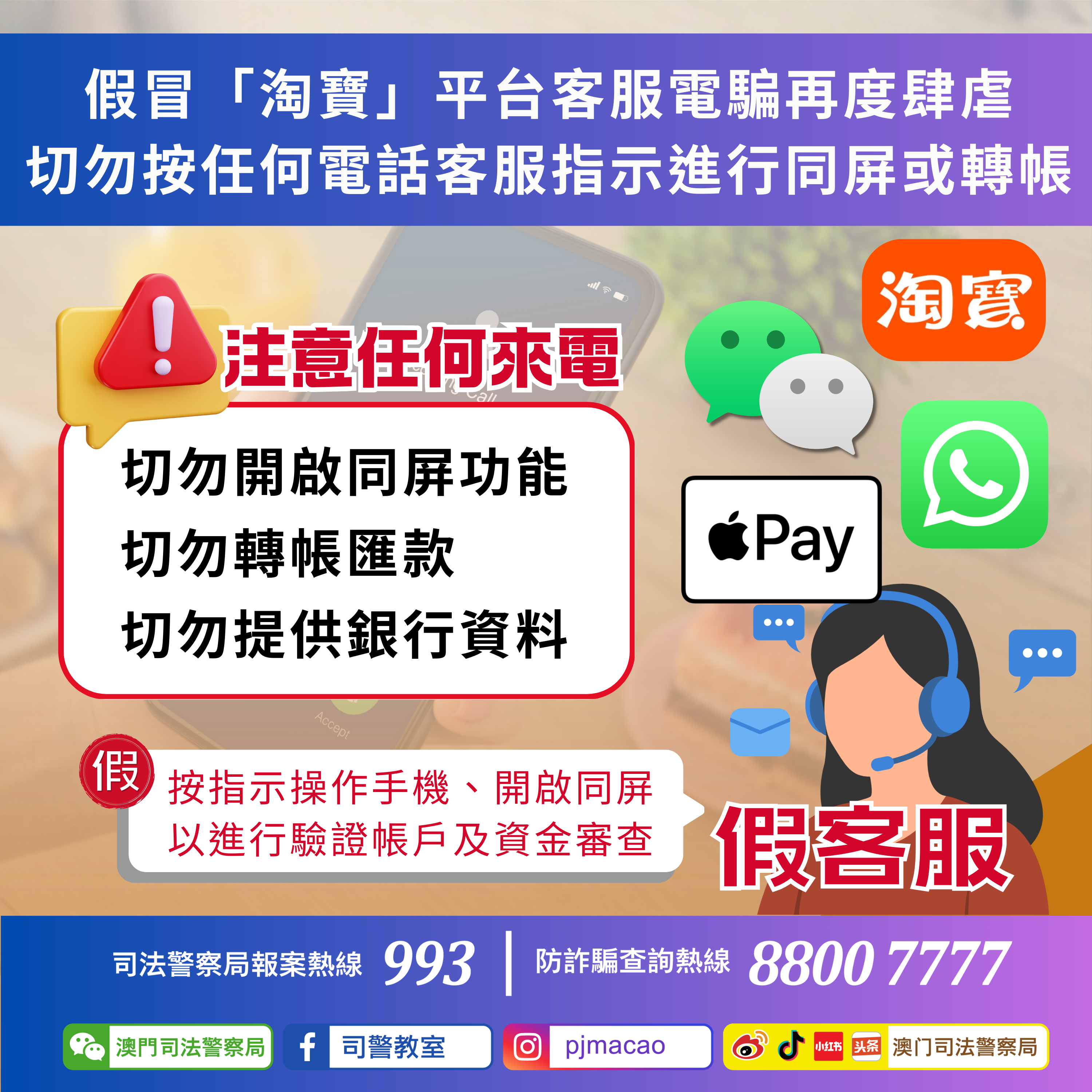 由3月9日至今,司警局接到多名市民檢舉,報稱收到騙徒假冒各大機構(包括淘寶、支付寶、微信、抖音、銀行等)客服人員的詐騙電話或短訊,訛稱市民的「資金或支付安全保障」即將到期及將每月自動扣費,要求市民如欲取消需按騙徒指示操作。事件中已造成至少13人被騙,損失合共逾327萬澳門元;另外,局方防騙熱線及反詐程式同樣收到近50名市民沒有被騙並提供相同犯罪消息。