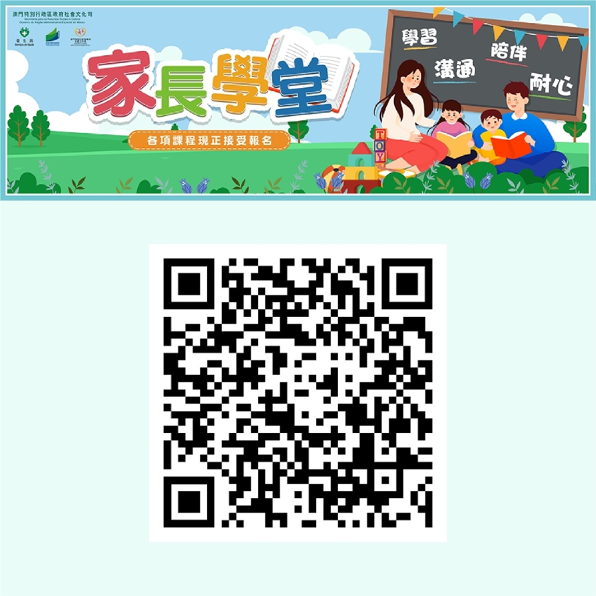 “家長學堂”透過以“3+2”主題作為課程框架,由母親懷孕、嬰兒出生、兒童期及青少年期分為四個成長階段,每個階段設有能力發展、家庭關係、身心健康共3個共同核心主題,以及按子女年齡成長特質而設定的2個主題,讓家長具體了解育兒策略和技巧,幫助家長面對兒童成長的各種挑戰,有效建立正向親子關係,營造和諧家庭氛圍。“家長學堂”將持續提供線下課程,並精選熱門課程於網上直播,以及陸續把直播課程的重點,剪輯成精華片段或製作圖文包供家長重溫,讓家長不受時間及地點限制獲得實用教養資訊。歡迎家長掃瞄二維碼或登入:https://portal.dsedj.gov.mo/webdsejspace/site/parent_academy/index.jsp 瀏覽更多“家長學堂”資訊。