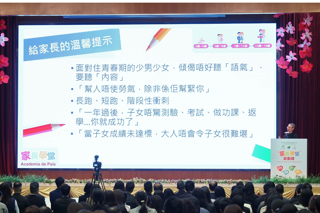 啟動禮上,龔志明局長、羅奕龍局長及韓衛局長分別作開場發言。龔志明局長分享“家長學堂”在試營運期間,推出了近40個課程,家長反應熱烈。今年計劃針對子女成長各階段,整合三局資源設計120至150個課程,並持續聆聽家長意見,與社會各團體攜手推出更多相關活動,共同陪伴孩子成長成才。羅奕龍局長提到,子女的學業與健康生活方式同樣重要。青少年是培養健康生活方式的黃金時期,例如培養他們的營養素養、有規律的運動習慣、壓力和情緒管理以及充足睡眠等,鼓勵家長多讓子女參與課外活動,幫助子女身心和社交健康。韓衛局長稱,當代澳門家長具備為孩子帶來幸福的條件,鼓勵家長教好和陪伴好孩子,致力讓孩子在健康、快樂、有愛的環境中長大,希望透過“家長學堂”多方攜手合作,共同為家長賦能,構建一個更友善、更具包容性的成長環境。活動現場亦邀請到多名家長教育講者,分別圍繞母親懷孕期至子女在各成長階段的重點關注,包括產前支援、親子溝通、環境創設與啟蒙、電子產品界線、習慣養成與學習期望、情緒教育,向現場參與者進行分享,傳遞家長教育子女所需的關鍵訊息。