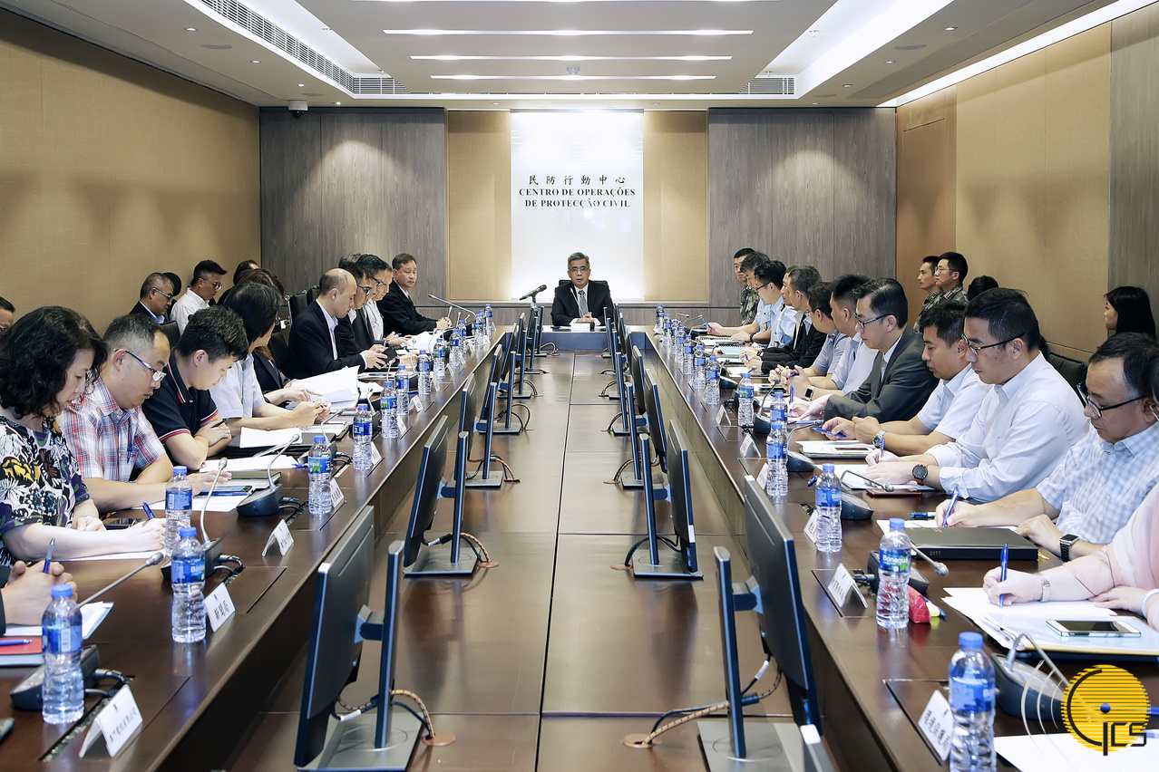 The Secretary for Security, Mr Wong Sio Chak, chairs a meeting at the Civil Protection Operations Centre to discuss arrangements in response to the approaching typhoons. During the meeting, the Secretary has received a report on the tracks and moving directions of typhoons “Barijat” and “Mangkhut” and the measures would be in place to mitigate impacts of the storms. Mr Wong has remained “Mangkhut” would be a powerful typhoon, adding all members of the civil protection system should take appropriate measures – including those for flood prevention – ahead of the storm’s arrival, in order to maintain the safety of the public.